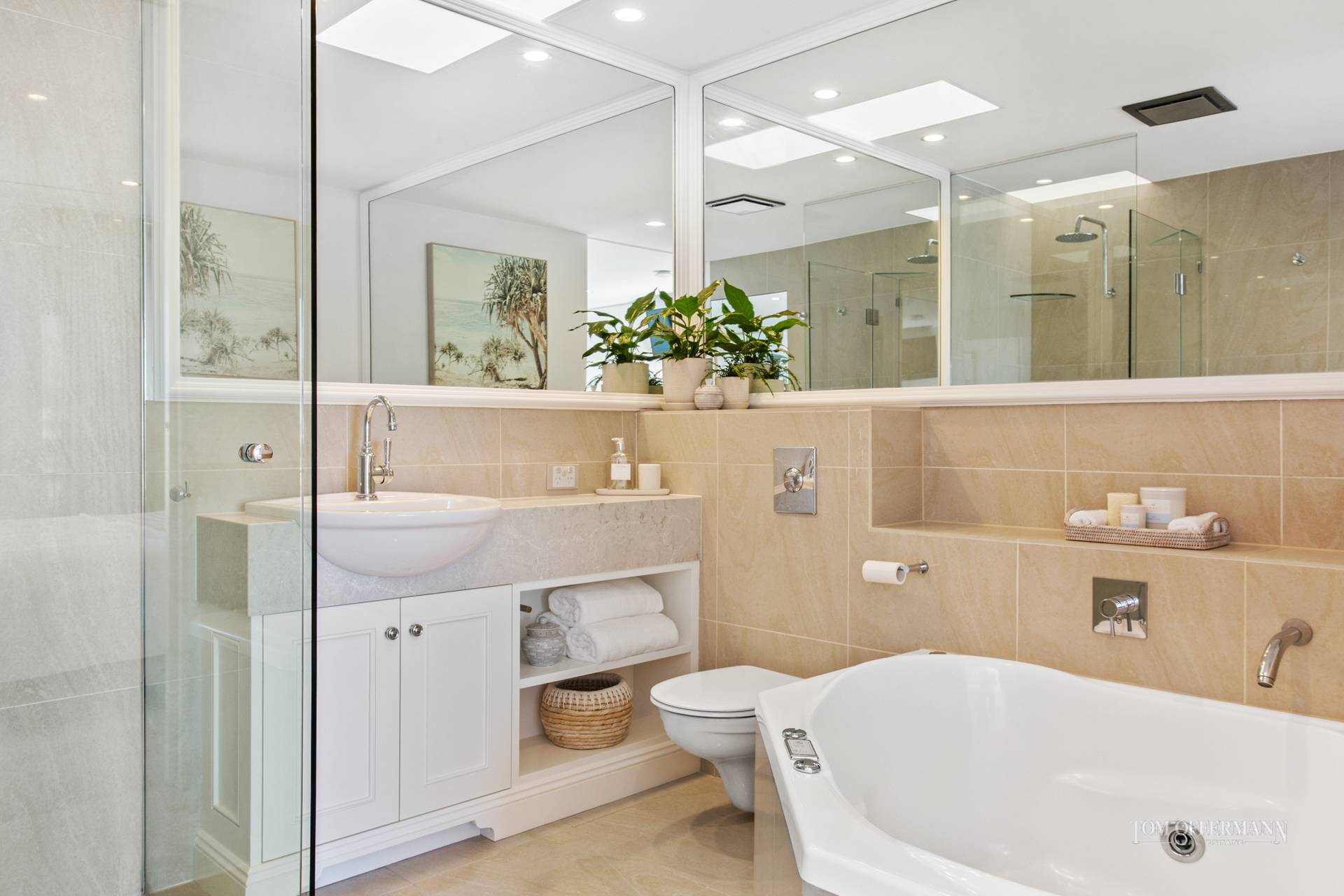 The twin and king-size suites on the north-side share a balcony overlooking the resident's-only pool. Two king-size master suites are on the waterside with more stupendous views over the Noosa River and Hideaway Island. Gorgeous limestone-tiled, stone-topped vanities in the bathrooms and share the balcony. The more lavish of the two master suites has it wrapping around on one side. It also has a hideaway television and home office.