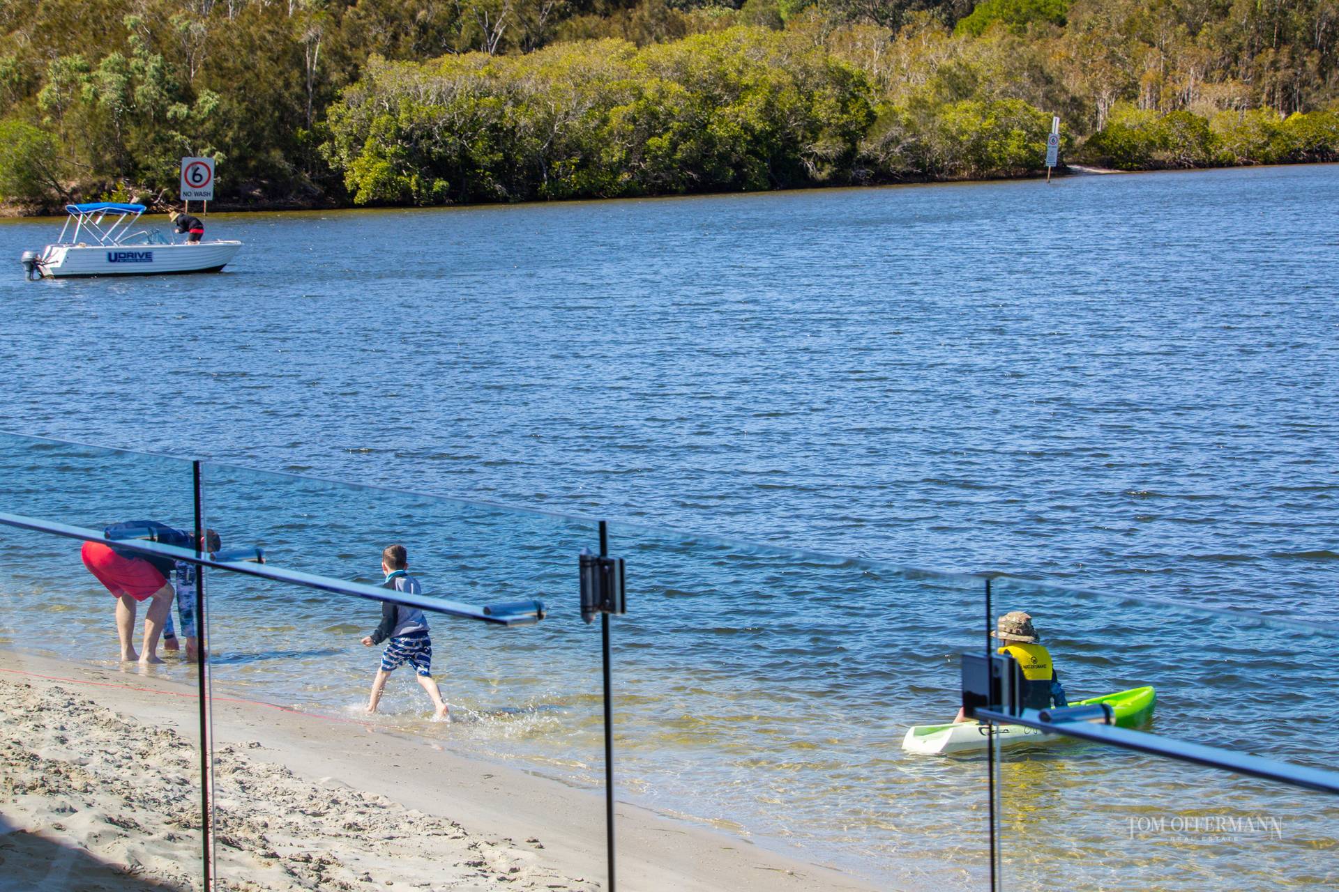 Beyond the jetty, a panorama of multiple, wide, turquoise-hued Noosa River waterways dotted with pleasure craft, melds with the lush green backdrop on the far side as well as a nearby park.