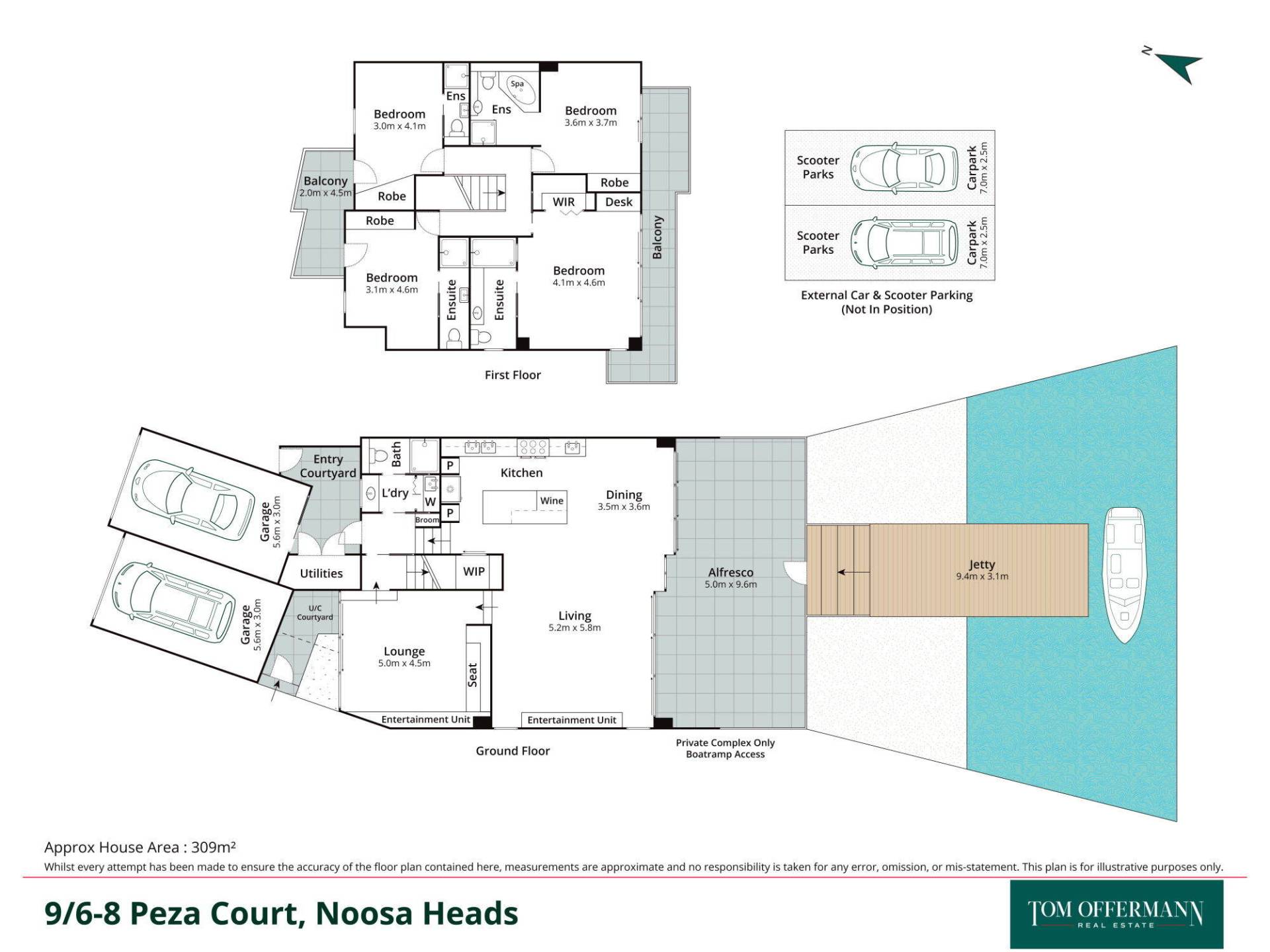 - Waterfrontage: 10m incl beach; new privately owned 9.4m x 3.1m jetty with built in service features, built in structural hardwood and 50mm Ultralife Eco5000 marine ply incl 25-yr guarantee; ramp access to boat launch via side of residence.