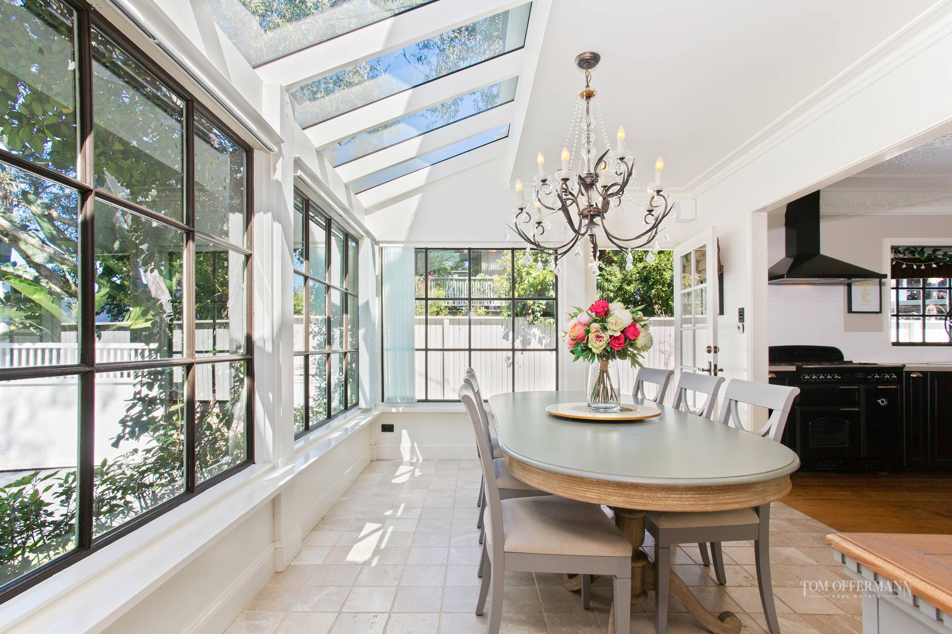 The dining room has conservatory-style ceiling and windows, cool tiled flooring and adding a sense of theatre centre stage, is a stupendous chandelier.
