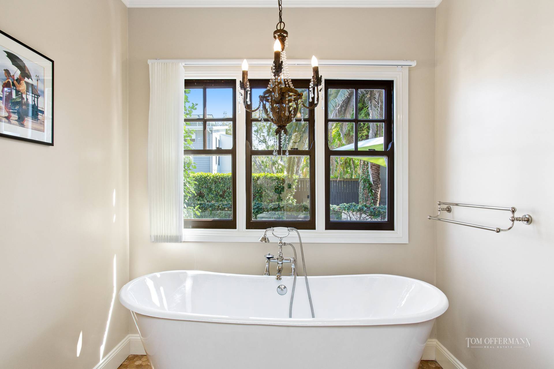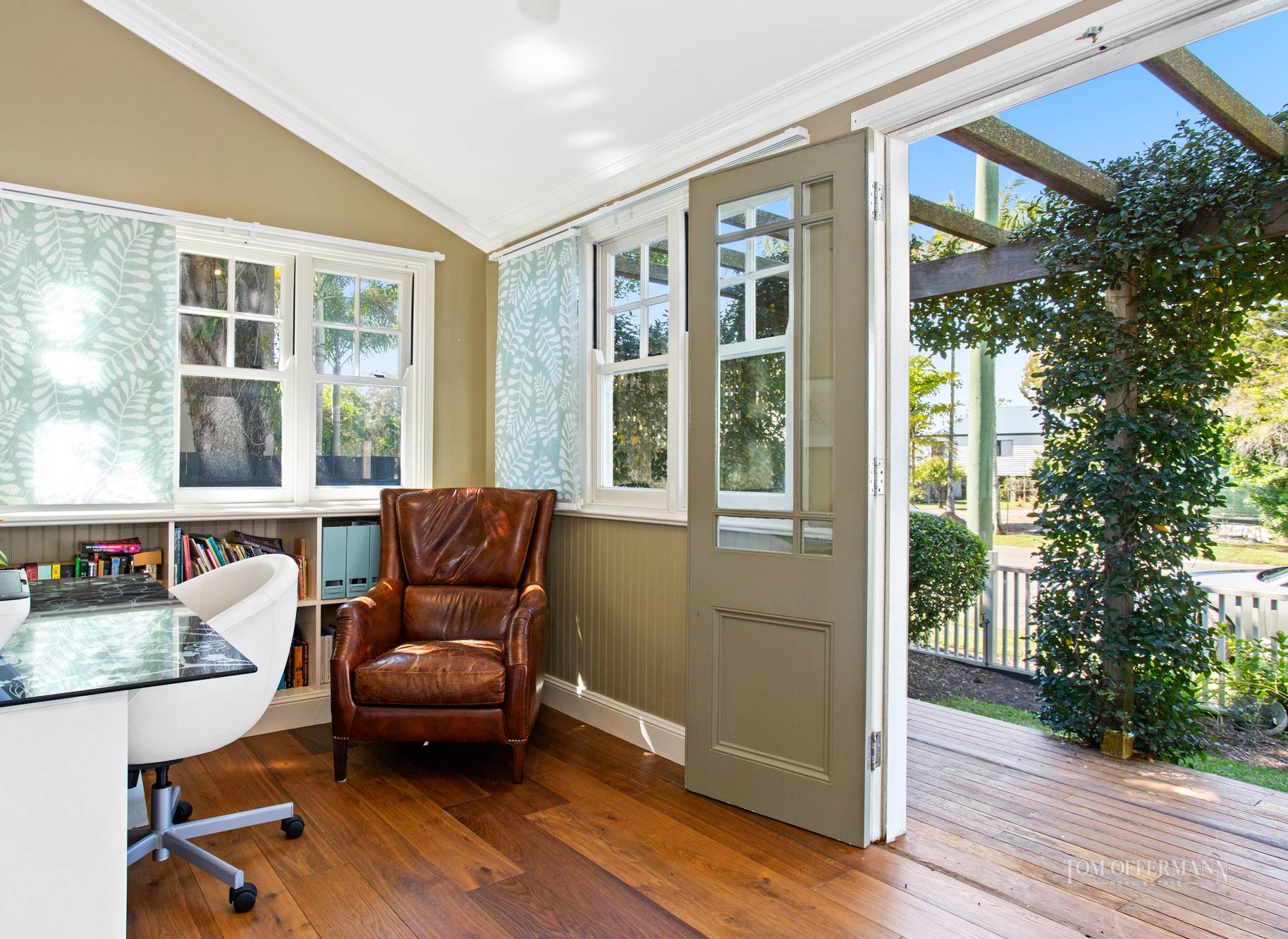 What a lush oasis awaits sunseekers, entertainers and families in the north-westerly back garden. There is a nod to Palm Springs with manicured low maintenance plantings, decks, espaliered glass fencing, a fantastic giant palm, and an outdoor room with storeroom and fireplace.