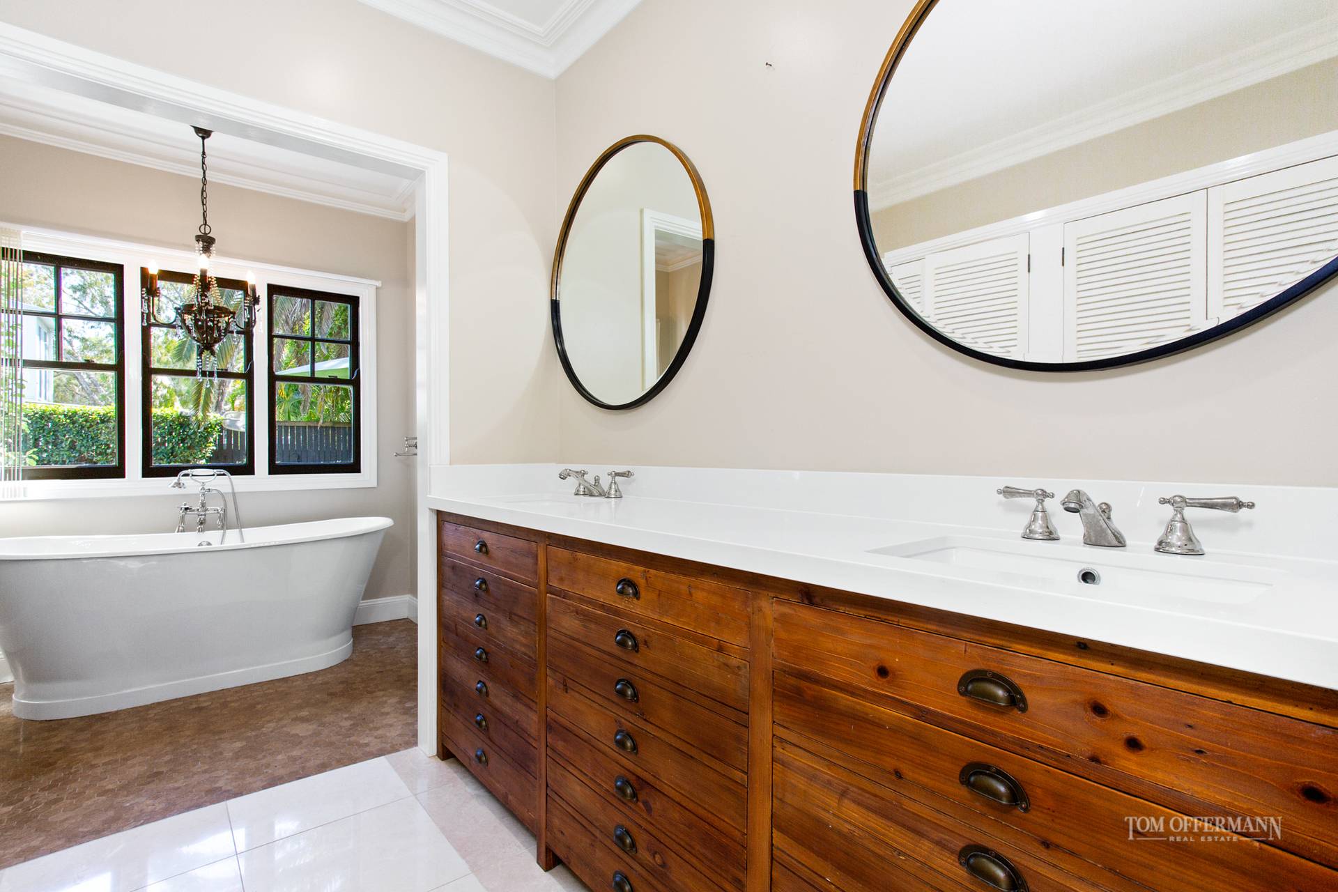 In the north wing is one of three master-style bedrooms, each with an ensuite and coffered VJ-profile ceilings. There is an oval bathtub, walk-in robe, and double vanities in the first suite. Next door is a powder room and with access from the foyer or front verandah is an office.