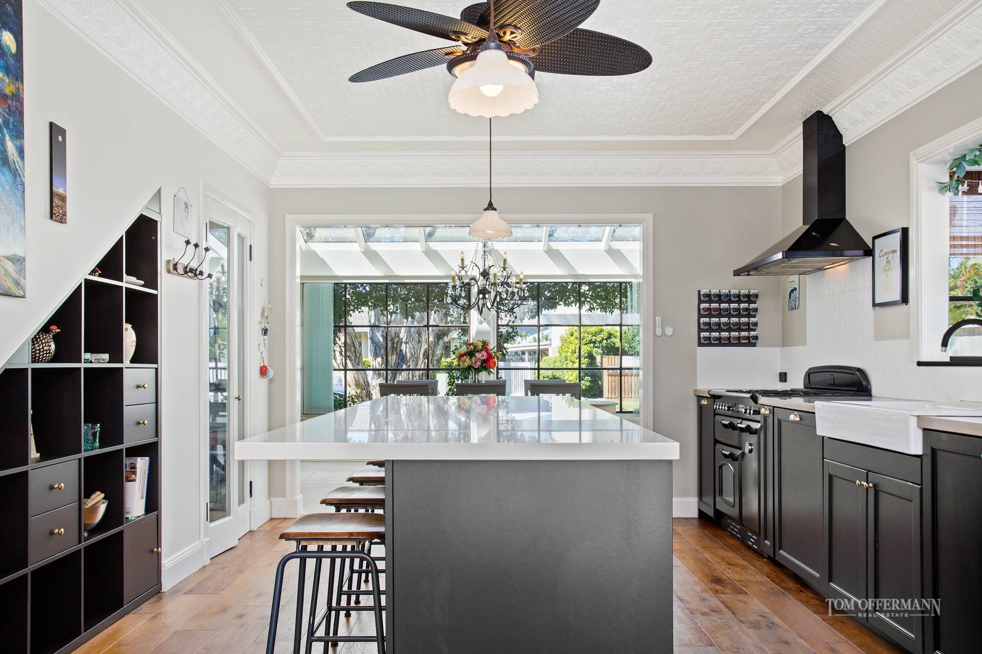 Retro rocks in the Shaker-style black kitchen with pressed metal ceiling, Falcon gas stove, double butler's sink, custom-made niches, walk-in pantry, and stone-topped island bench/breakfast bar.