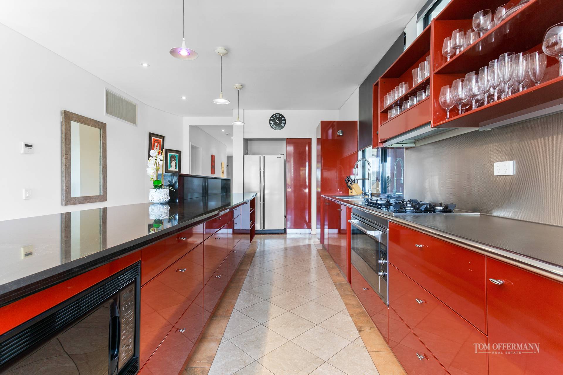 - Kitchen: 2-pac rich red cabinetry incl 5m island bench & breakfast bar with black granite benchtop; long bench with stainless steel top & splashback; Ilve 5-hob gas cooktop + oven; Panasonic microwave; Delonghi coffee machine; Samsung refrigerator