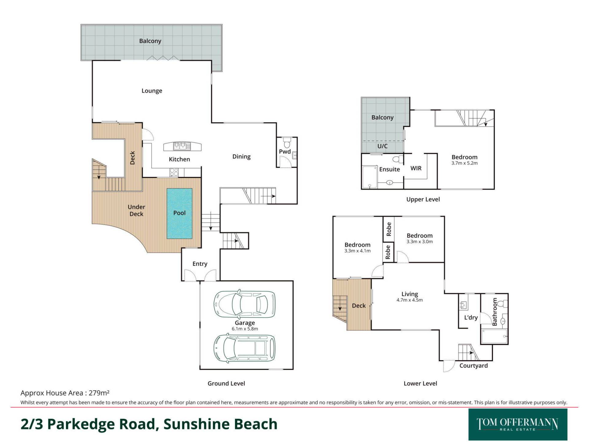 The master suite with private sun deck is on the top level and has filtered ocean views south to Maroochydore. The floor plan deftly separates two garden view bedrooms, laundry, bathroom and second living room on the lower floor.
