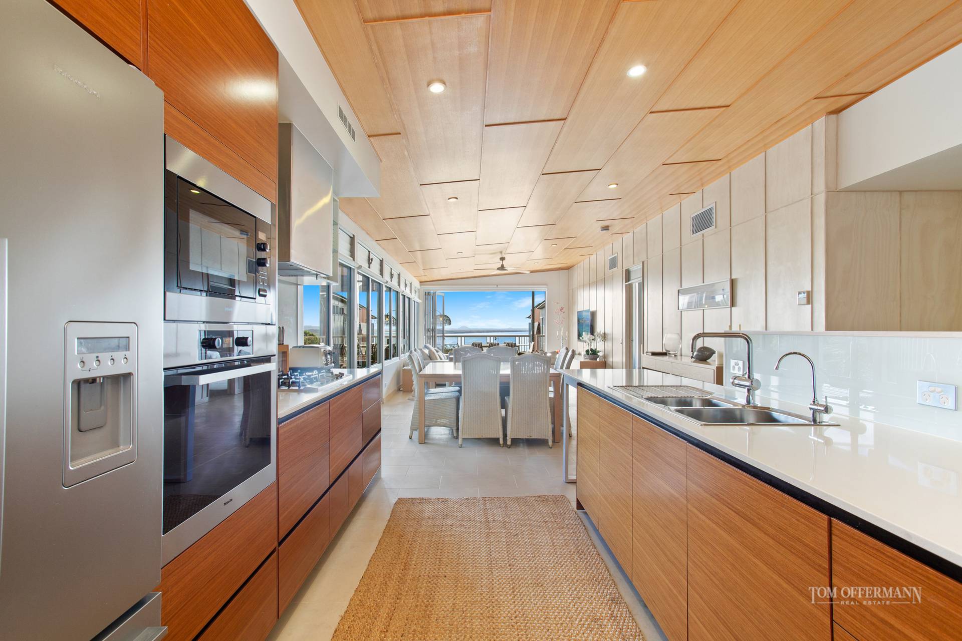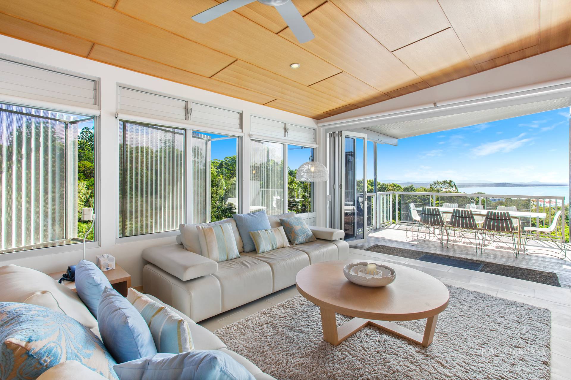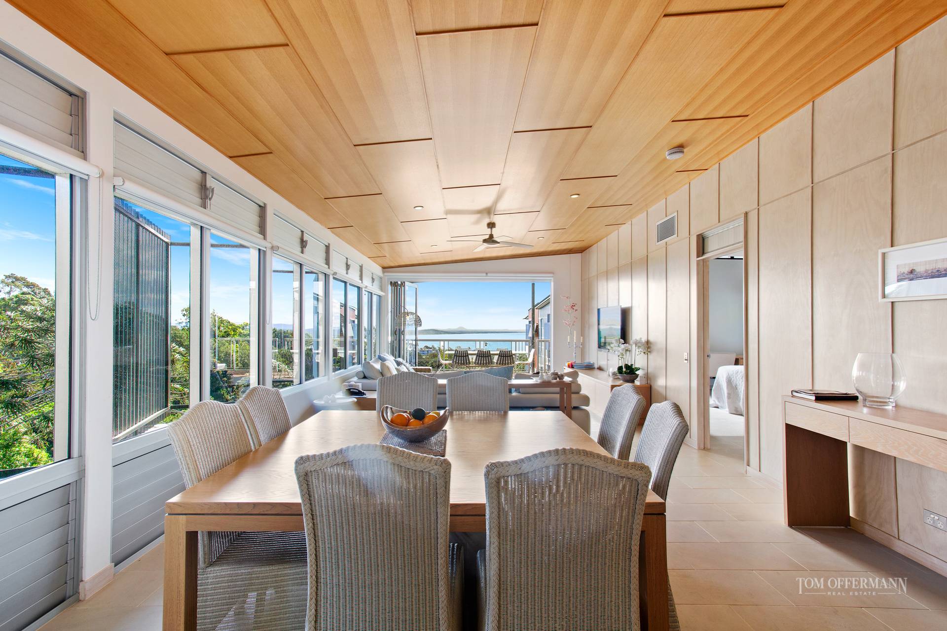 Designed by renowned architect John Mainwaring, the 2-level residence defines luxury on every level. Generous overhangs offer shade and are designed for the idyllic subtropical climate. Floors and high ceilings are ash, walls lime-washed, and balustrades polished stainless steel. Natural light, breezes and cross ventilation are via banks of glass panes and louvres plus fold-away doors opening from the over-generous living and dining spaces, which look as though they've been featured in the current issue of Belle magazine.