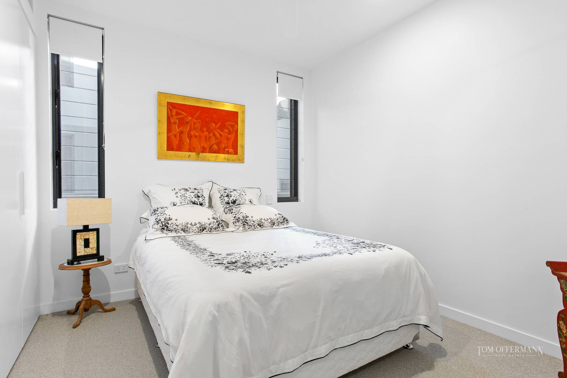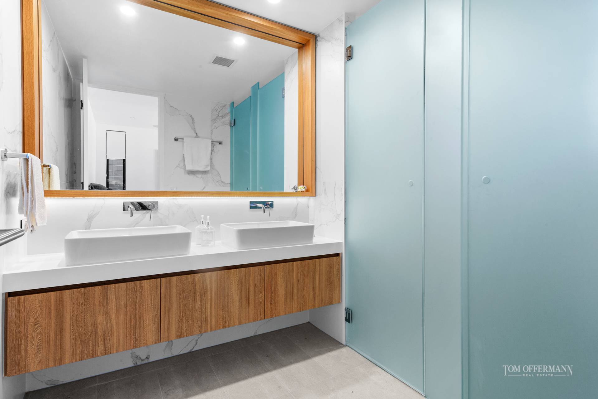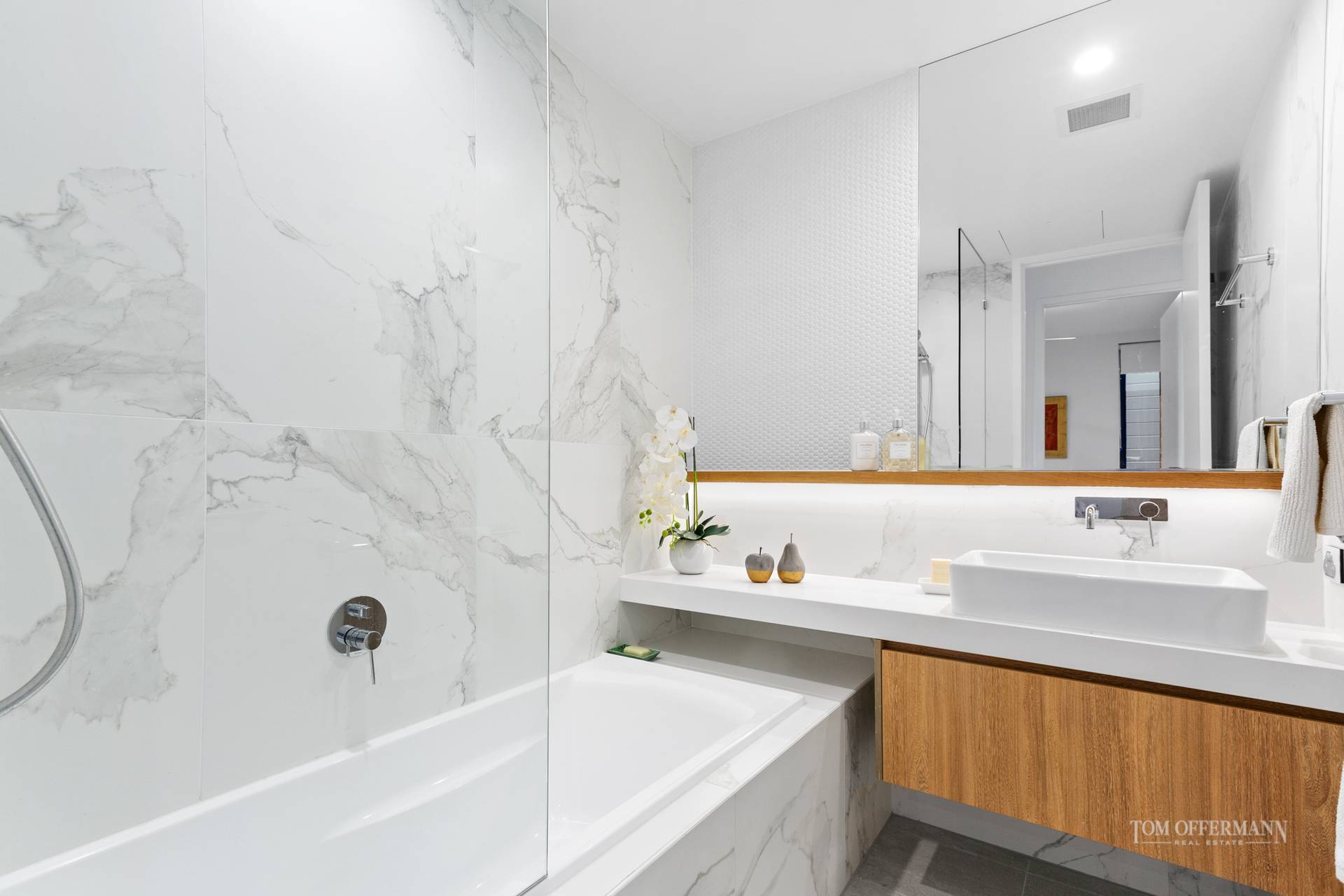 Ceilings throughout the apartment are lofty, and bright natural light is the sort that invites itself in through the banks of sliders. Motorised roller blinds add a practical and decorative aesthetic.