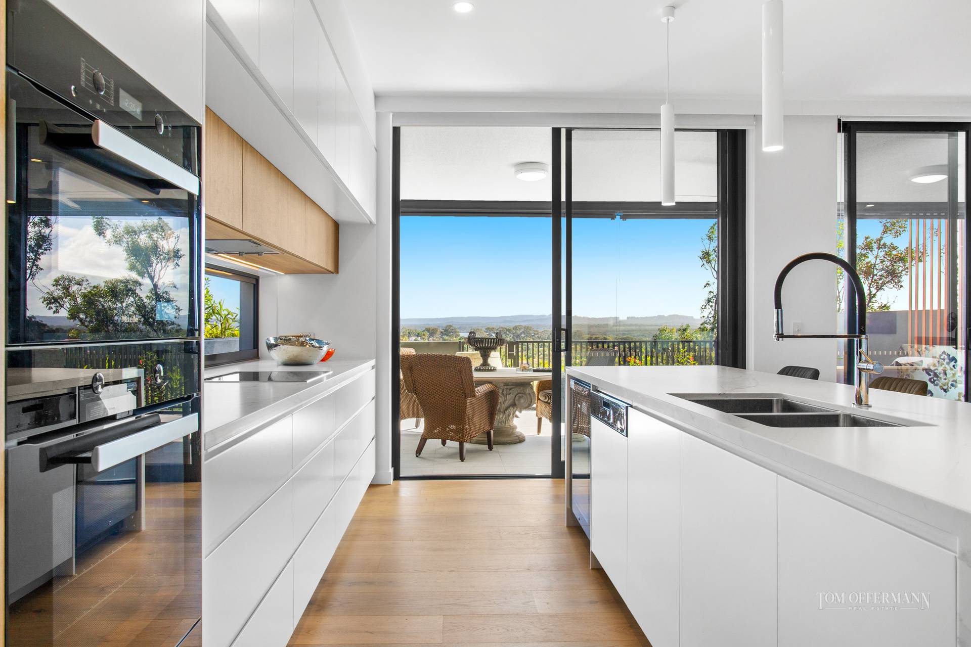 Also complementing the core fundamentals of a truly functional and a well thought-out interior design is the sizeable kitchen with designer pendants, walk-in pantry, Vintec wine fridge, stone-topped 3.5m island bench, Miele appliances and a lengthy picture window in place of a splashback.