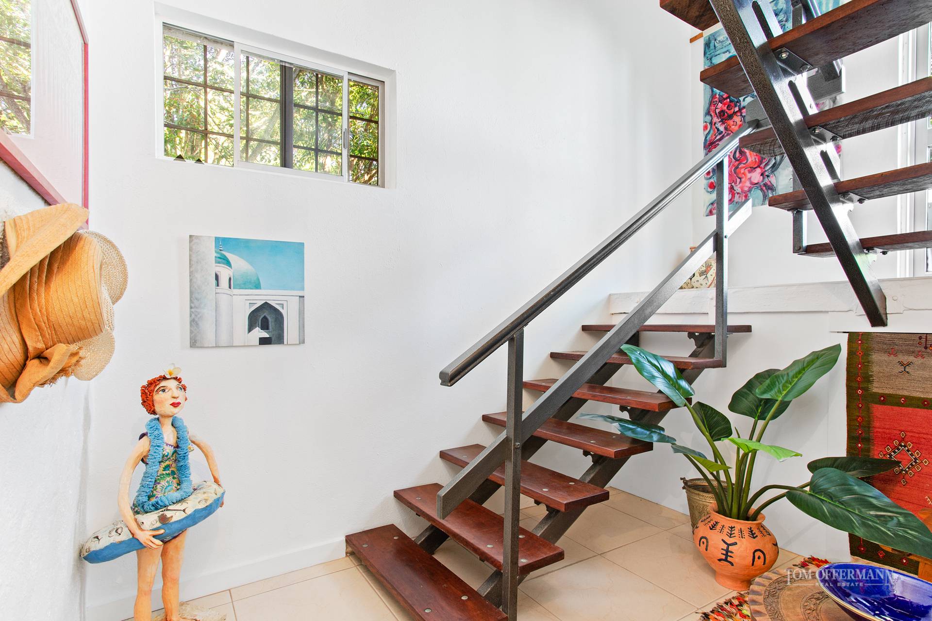 Stairs with timber treads lead to the upper level which is filled with the owner's memorabilia and reminiscent of a gallery.