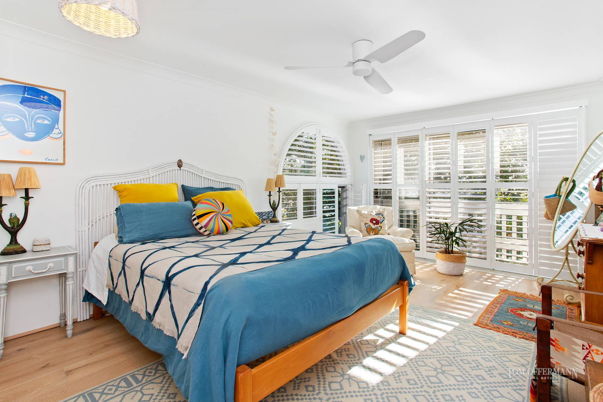 On the first level the hallway is dressed with stunning white-washed oak flooring through to the generous master bedroom with its northerly aspect, undercover Juliette balcony, louvres, and custom-made plantation shutters including curved to fit one window. Morning coffee accompanied by birdsong is surely a daily occurrence.