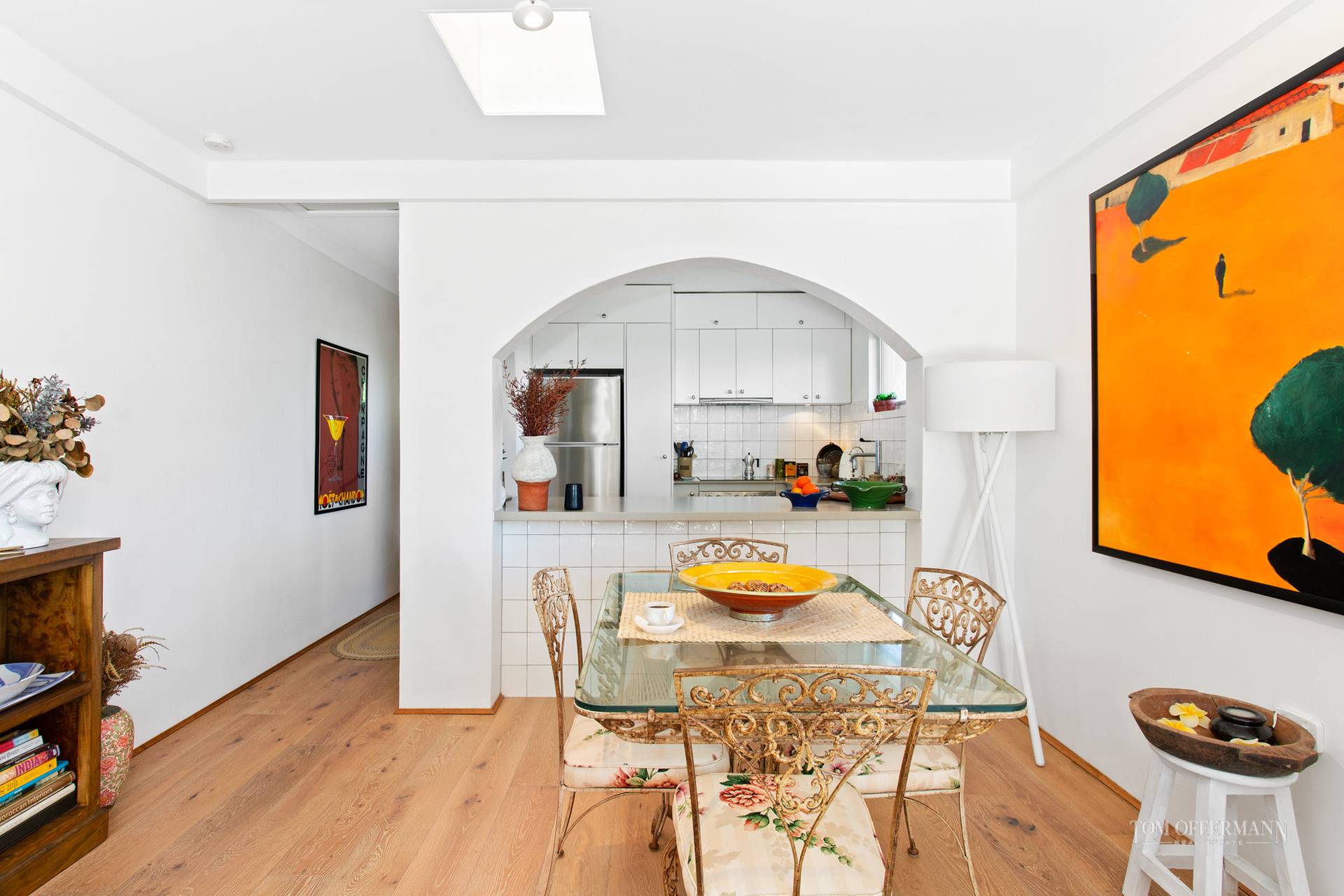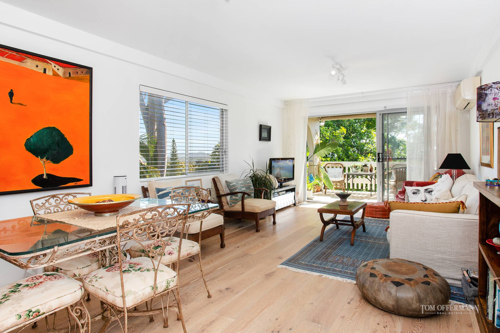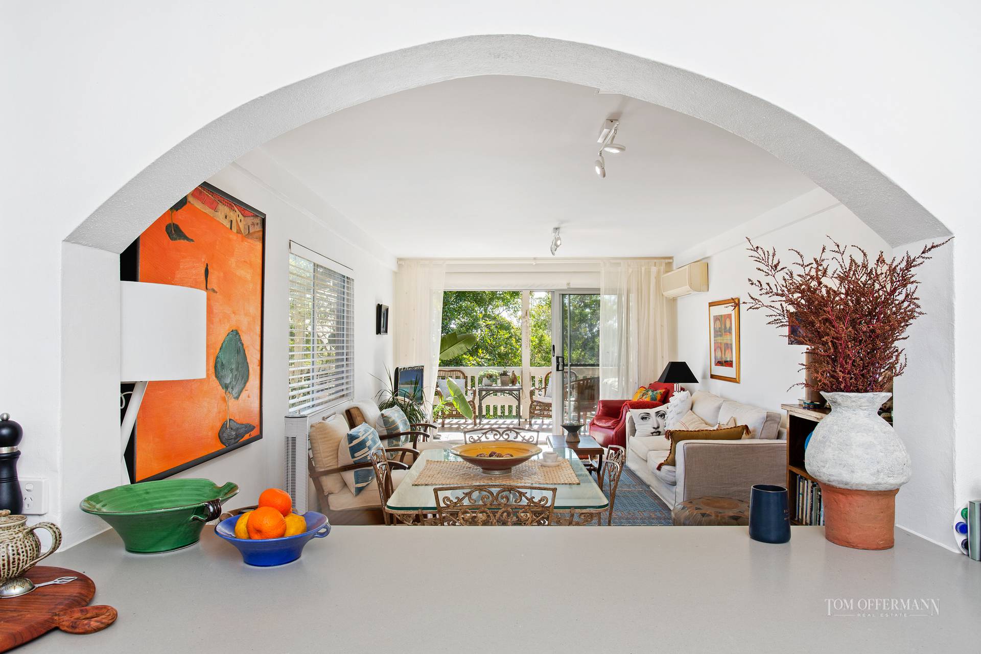 The sundrenched open plan living and dining spaces with white-washed oak flooring, make a seamless connection alfresco to the tiled patio with drop-down blinds and Spanish-style arch, as per the building's exterior.