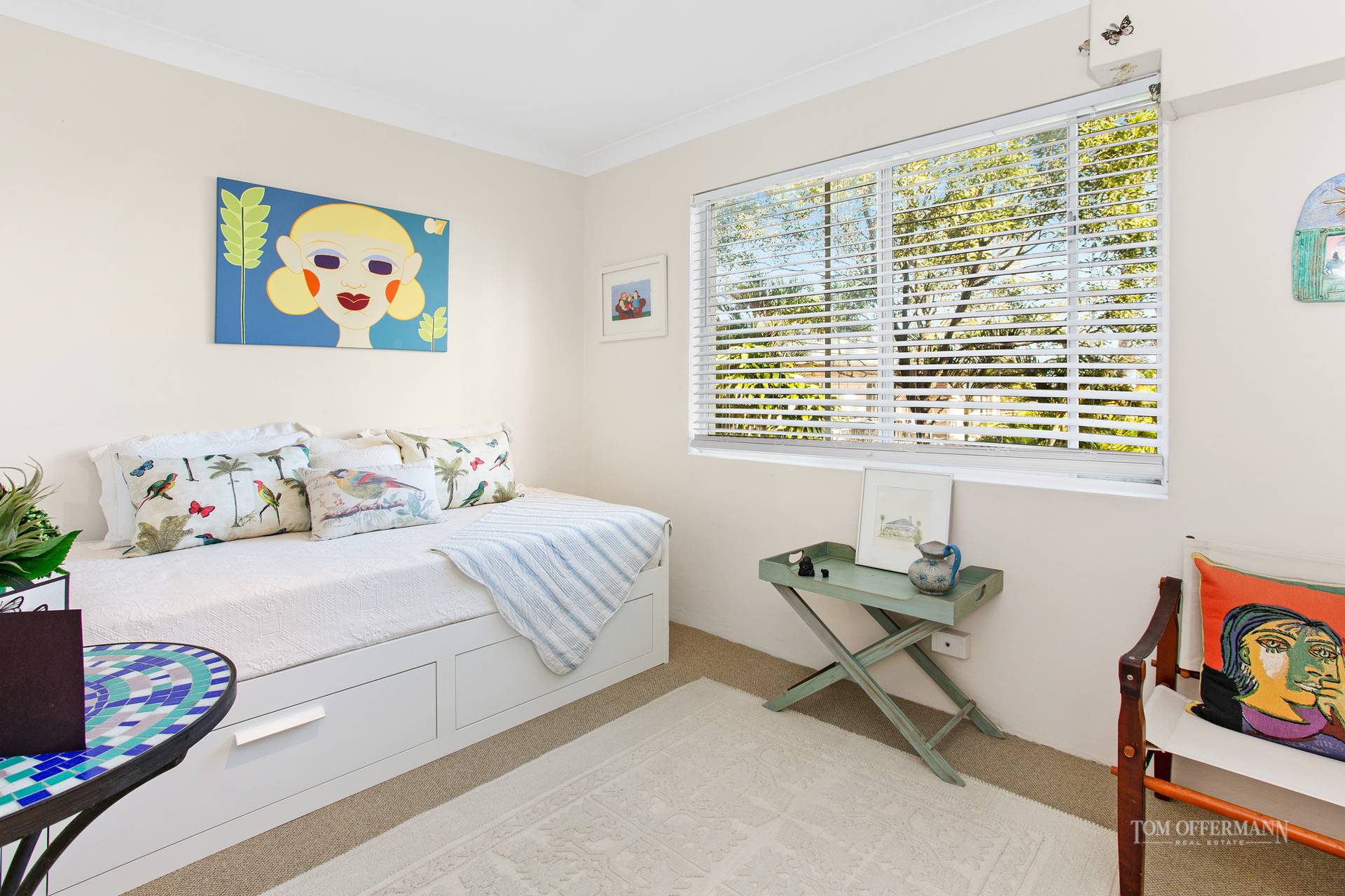A second bedroom is carpeted, and both have built-in robes and a green outlook, while the bathroom has alabaster white-washed cabinetry with marble vanity, an exemplary Italian tiled feature wall, plus floor to ceiling tiles.