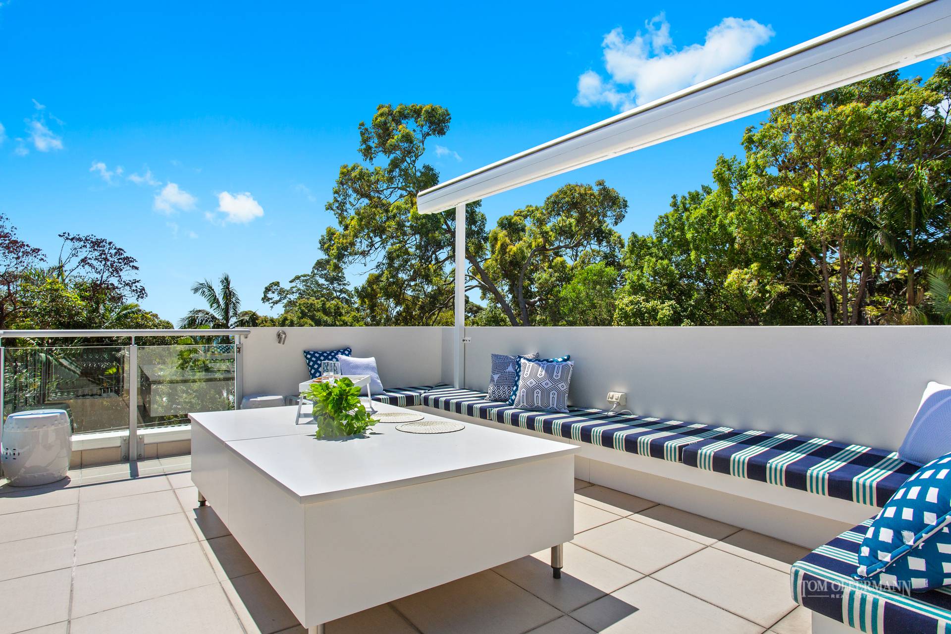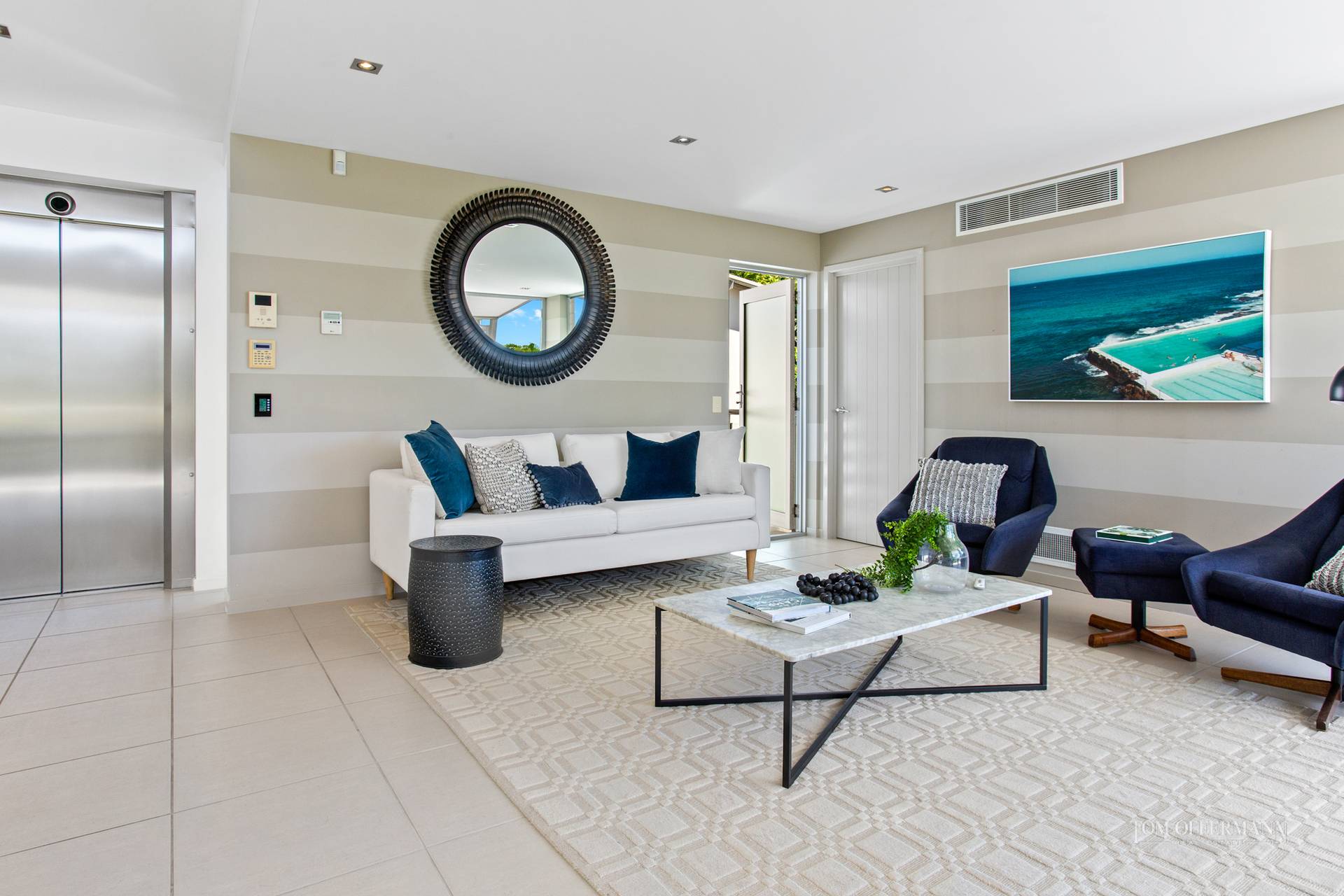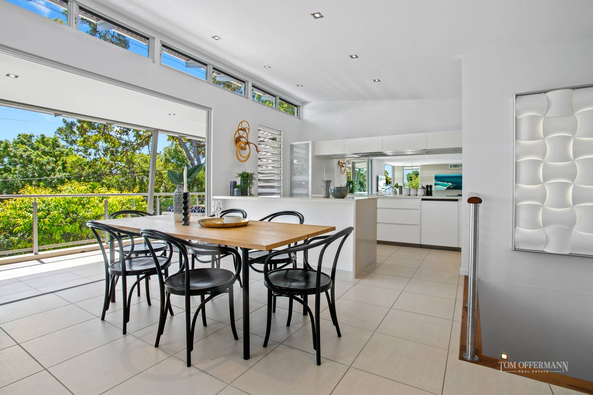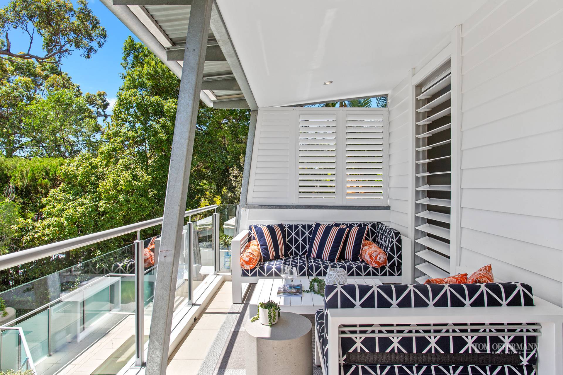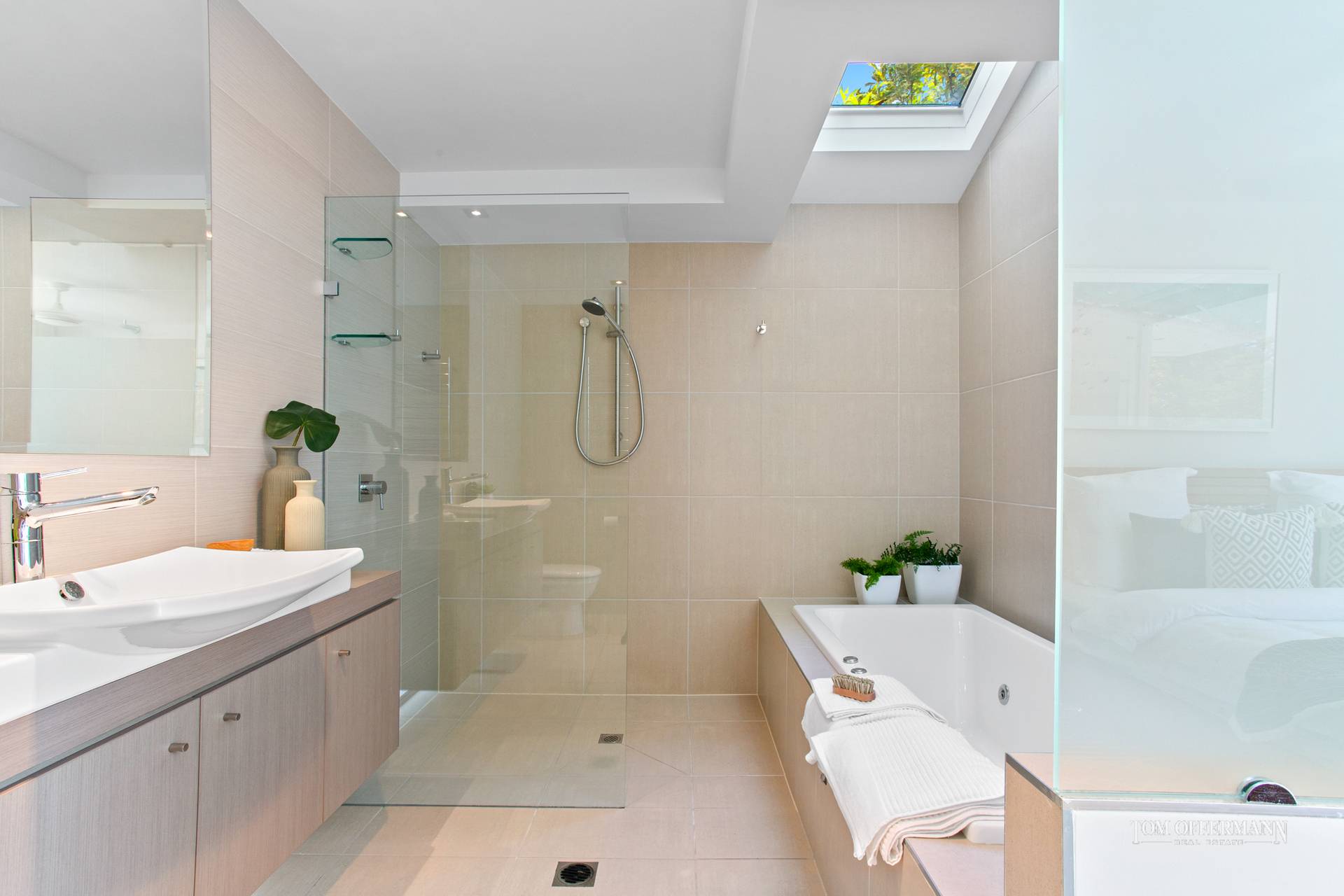 On the next level, admire the palette of finishes, colours and materials in the high-ceilinged, sun drenched living spaces. Travertine, feature paint, and a white sculptured light feature add an aura of luxe. Glass sliders 'disappear' and indoors stretches to another wide north-facing terrace with a treetop backdrop, where magnificent views are snared, louvres capture ocean breezes and alfresco dining alternatives are all synonymous of loving the good life.