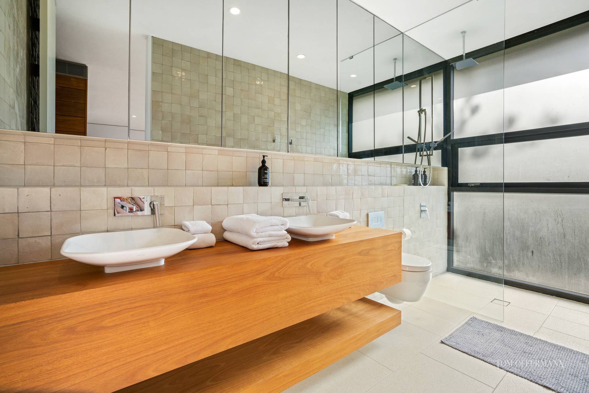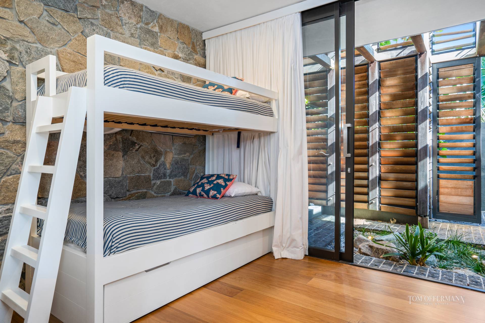 Another talking point is the master suite, more a retreat with walk-in robe, super-sized ensuite with double-sink vanity and drencher shower, plus floor-to-ceiling muslin curtains flowing with the ocean breezes and filtering the views. It opens out to a courtyard garden on the westerly side.