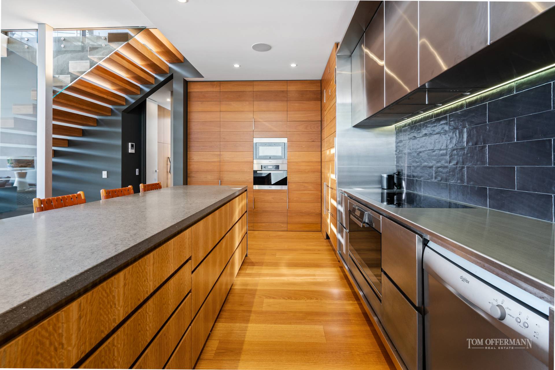In a residence of this calibre expect the kitchen to be the perfect match. It is. The combination of timber with stainless steel, high sheen black tiled splashback with feature lighting, and high-end appliances with stone-topped bench tops is clever.