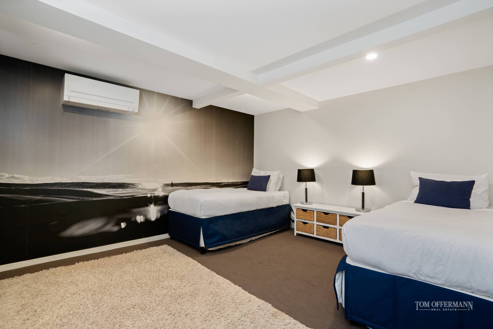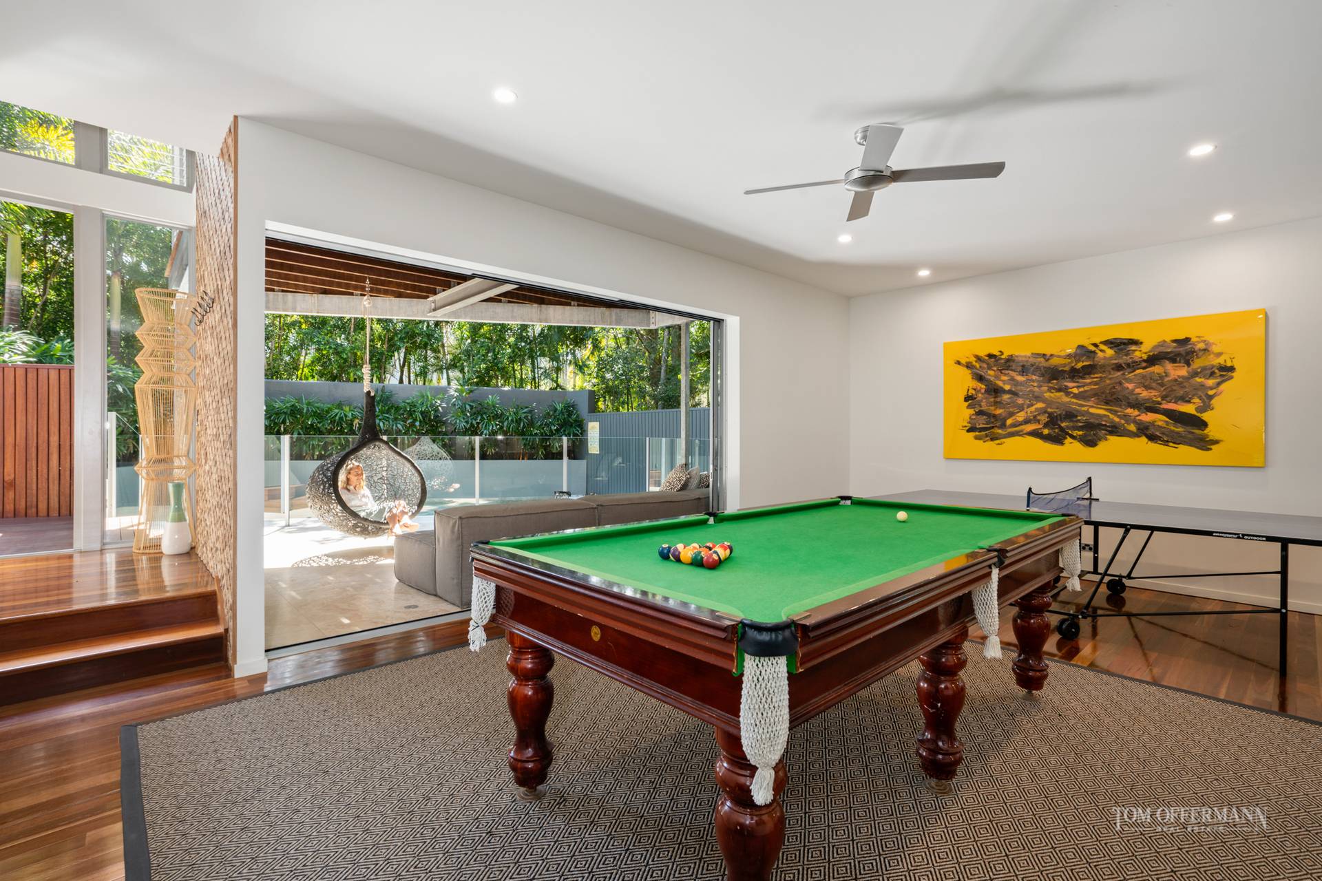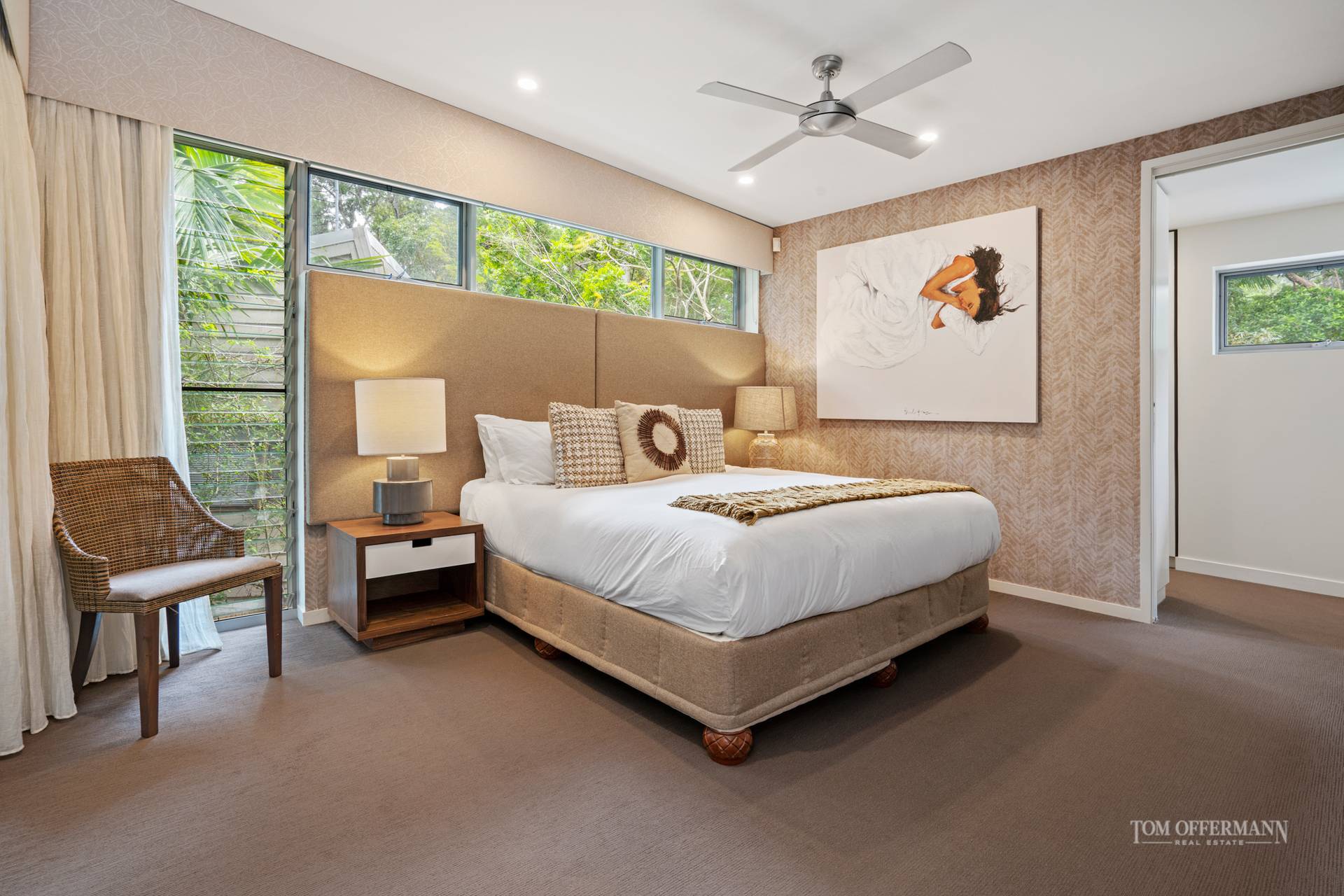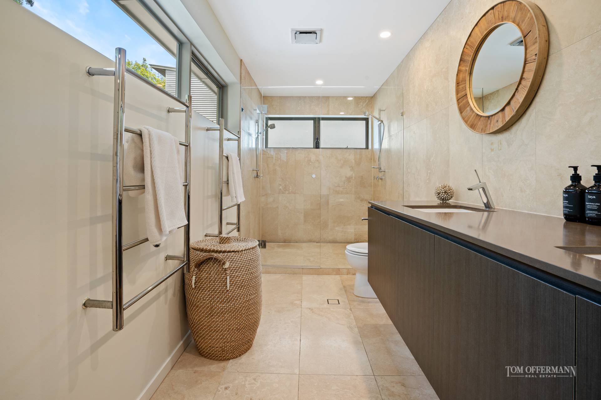 In the north wing, a chic master retreat with walk-in robe and large travertine bathroom with double shower, has a private deck and rainforest views. Morning coffee accompanied by birdsong whilst deciding on surf breaks, sounds de rigueur. Two queen size bedrooms share a family bathroom which also has travertine wall and floor tiles.