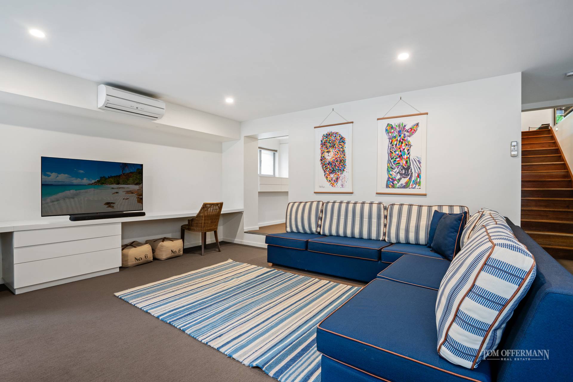 On the lower level is a true teen's domain, a living/media space, with custom built desk, bedroom big enough for four, eye-catching mural, a bathroom, also the laundry.
