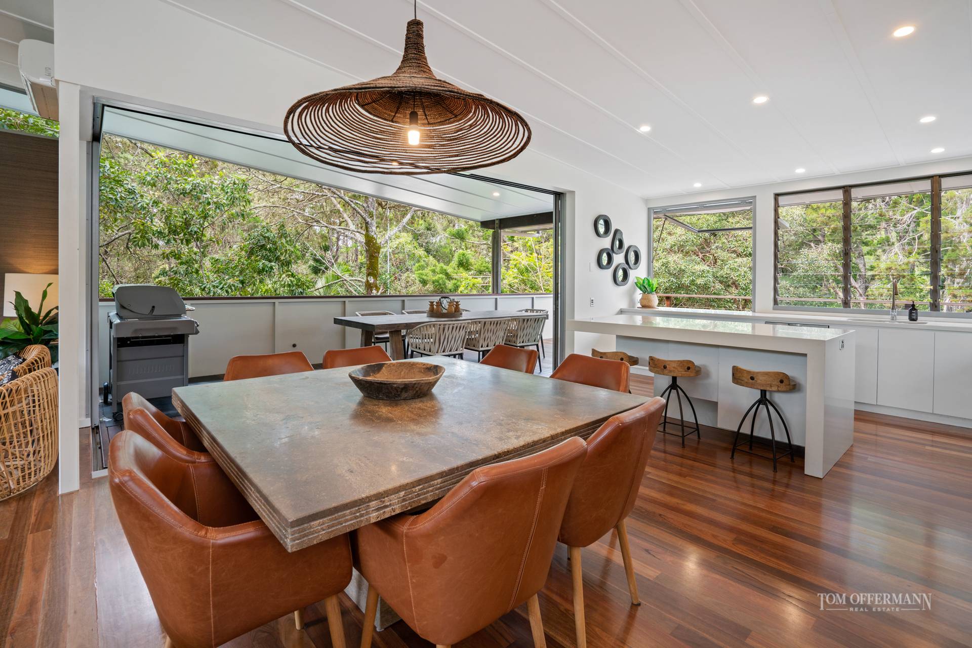 Relaxing or entertaining options offer class or casual, indoors, or out. You choose. The lounge with its bespoke cabinetry extends in a seemingly transparent way to the covered western deck, similarly the dining space which sweeps out on the north side, totally wraps around the eastern side with rainforest backdrop and has a gas-lift servery from the kitchen. Needless to say, every high-end accoutrement awaits the enthusiastic cook.