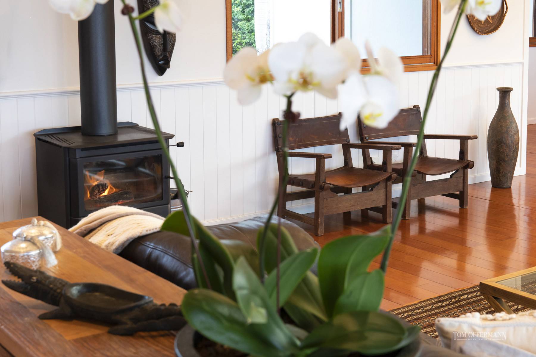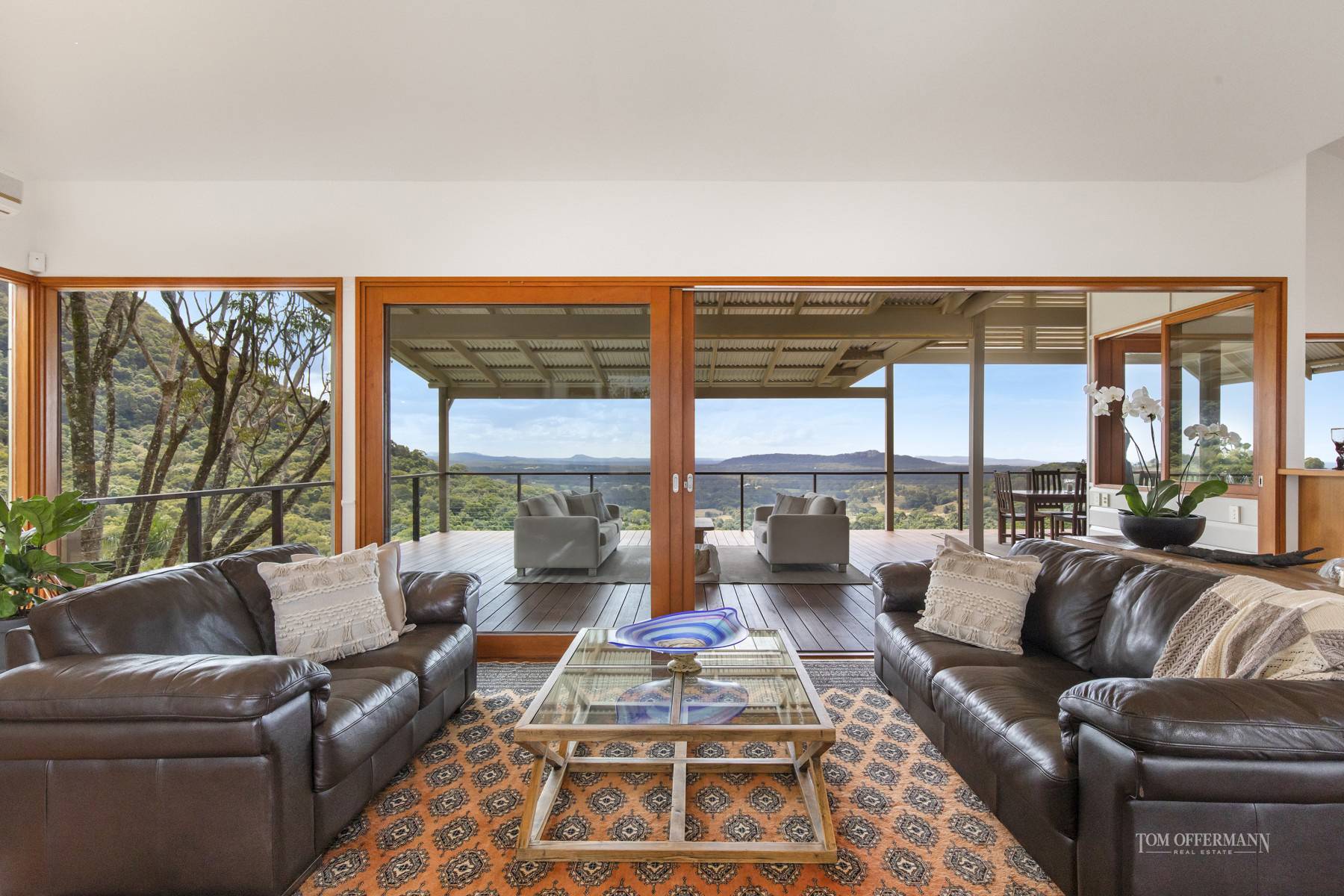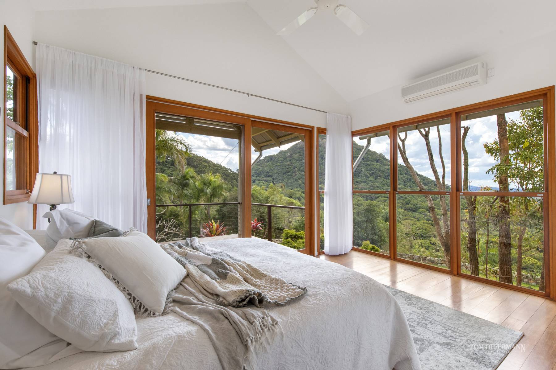 With Stephen Kidd's signature on the design there is no doubting the integrity of his work. From the moment the front doors open, eyes are fixed to the main massive deck on the northerly side, looking as if it's been in place forever, thanks to the beautiful botanical-style gardens. They not only enfold this home on its own private hill top but stretch sublimely in tune with the landscape to the verdant rain forest beyond the boundaries. Naturally, there is an abundance of bird life as neighbours such as kangaroos hop by.