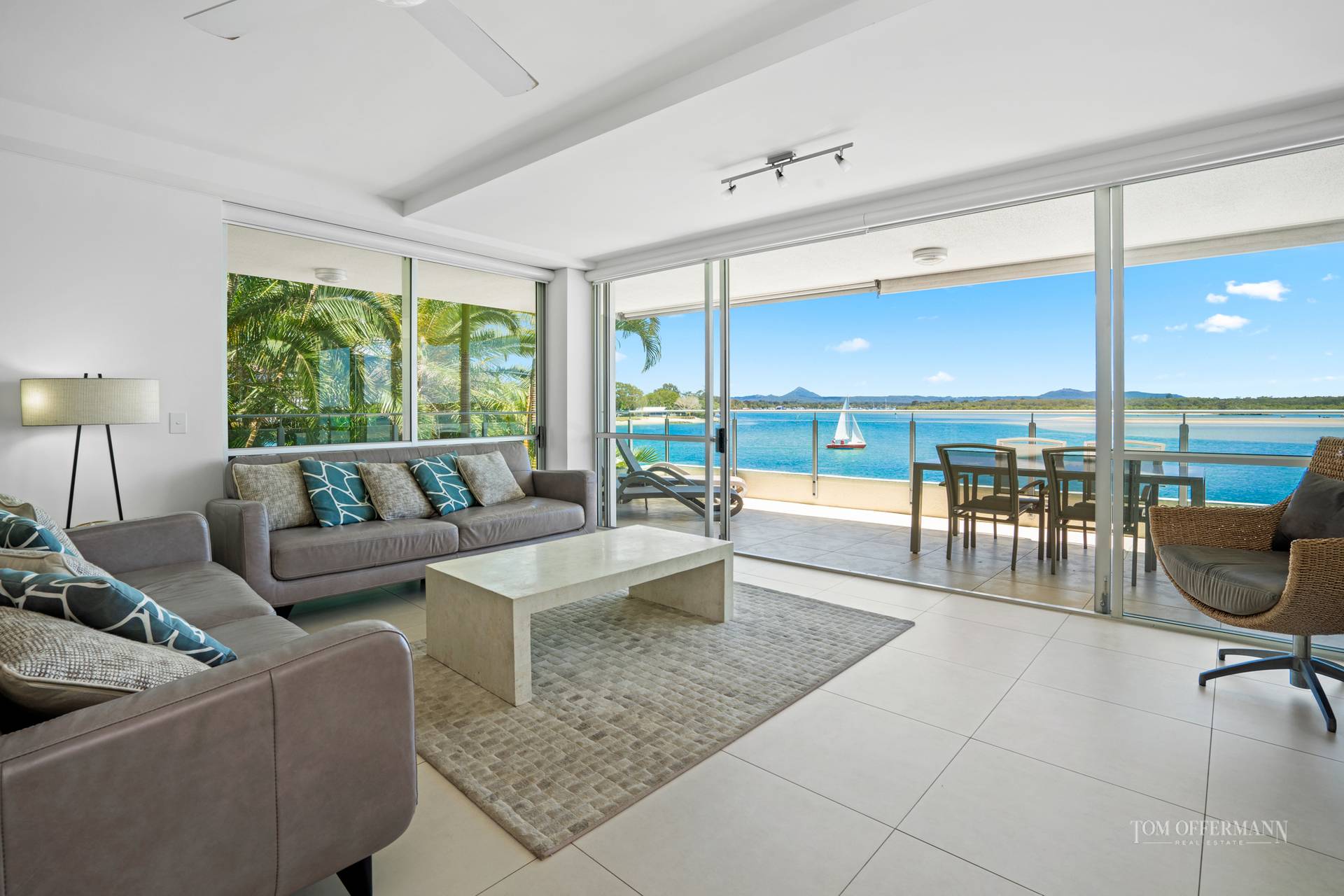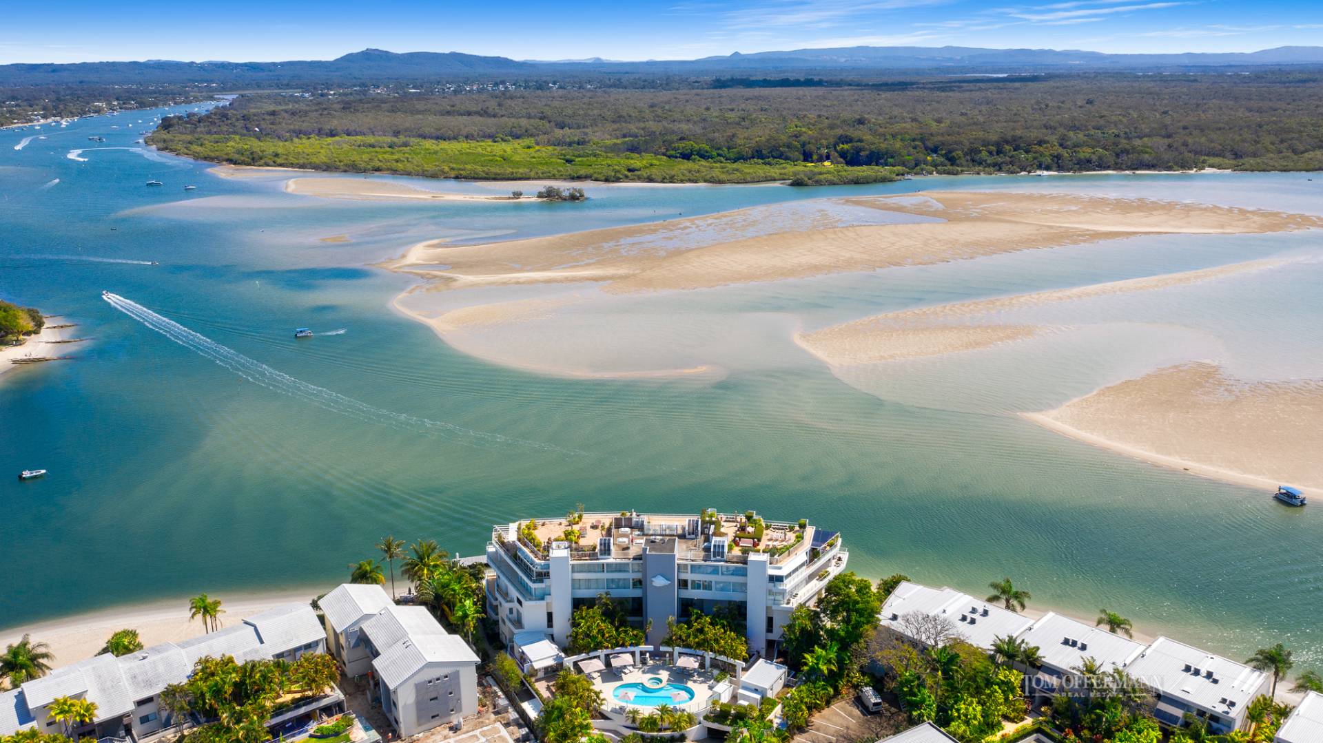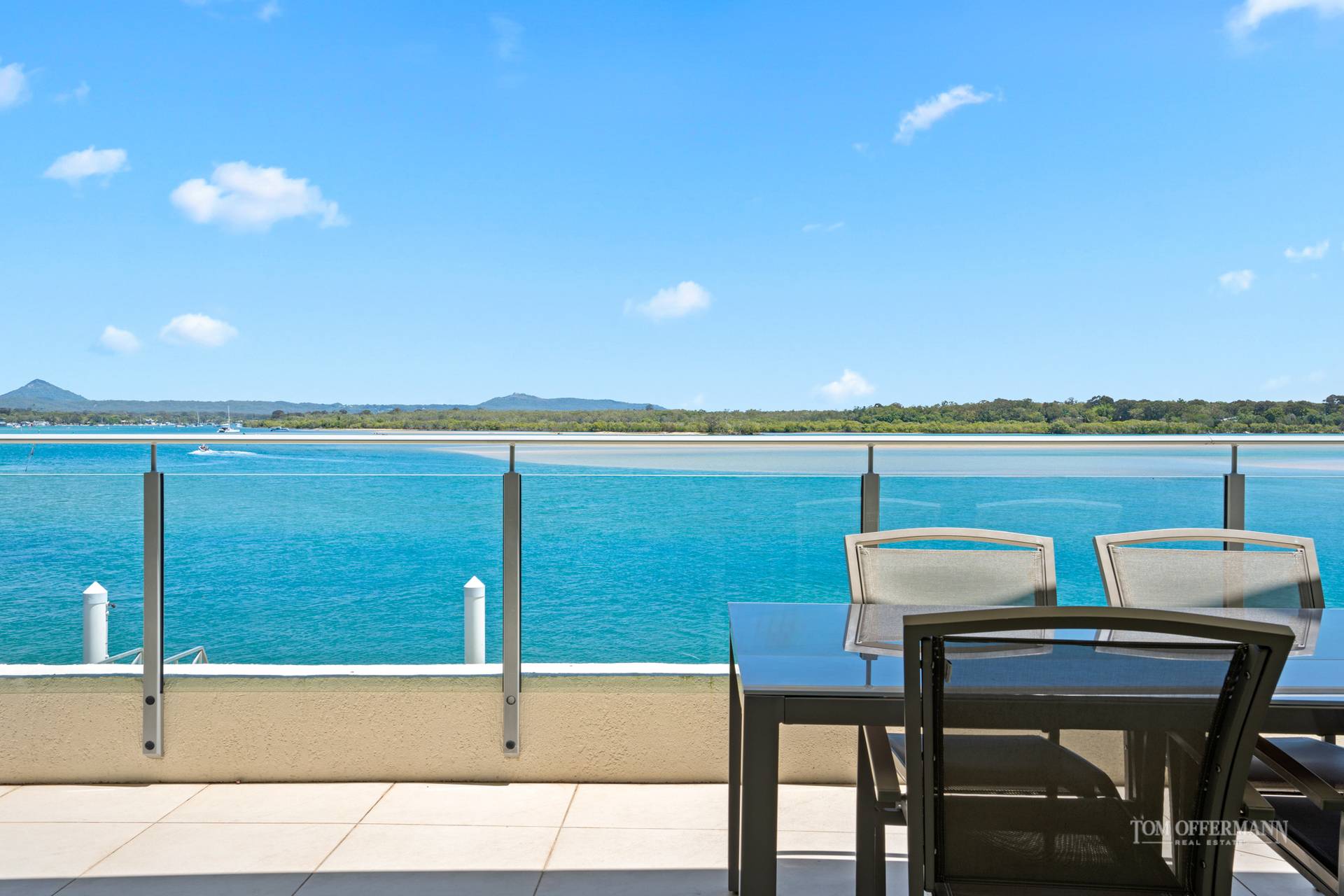 Picture an impressive apartment with an invisible line between indoors and out, seemingly suspended over a white-sand beach, jetty and riverfront with bedazzling seascapes across the Noosa River to the North Shore and beyond to the Coloured Sands. Eyes south along the park-fringed Noosaville foreshore which stretches to the Everglades. Beyond is Mount Cooroy. Gull's eye views of the azure waterways around Noosa Heads, river mouth and national parks are on the right.