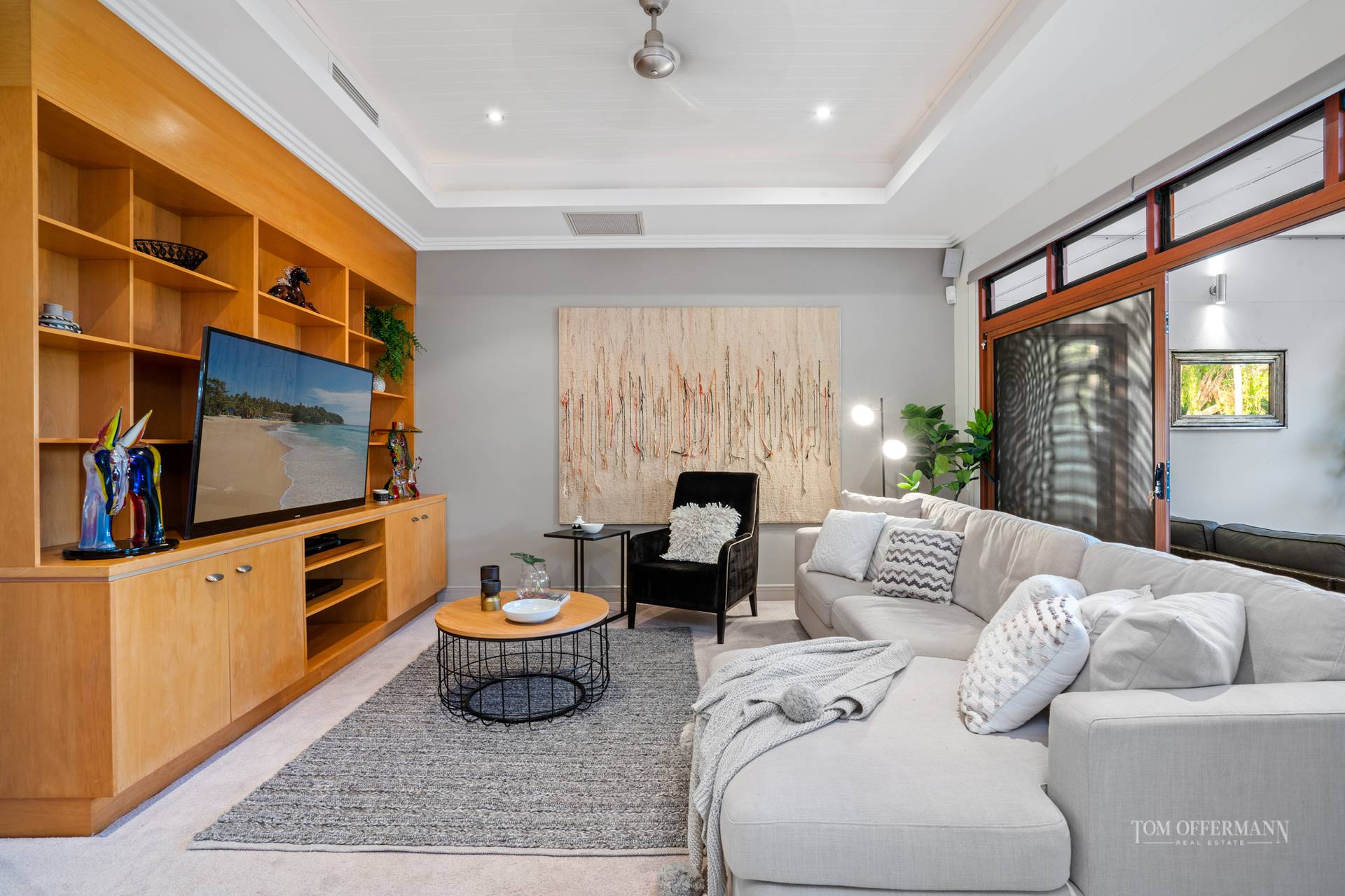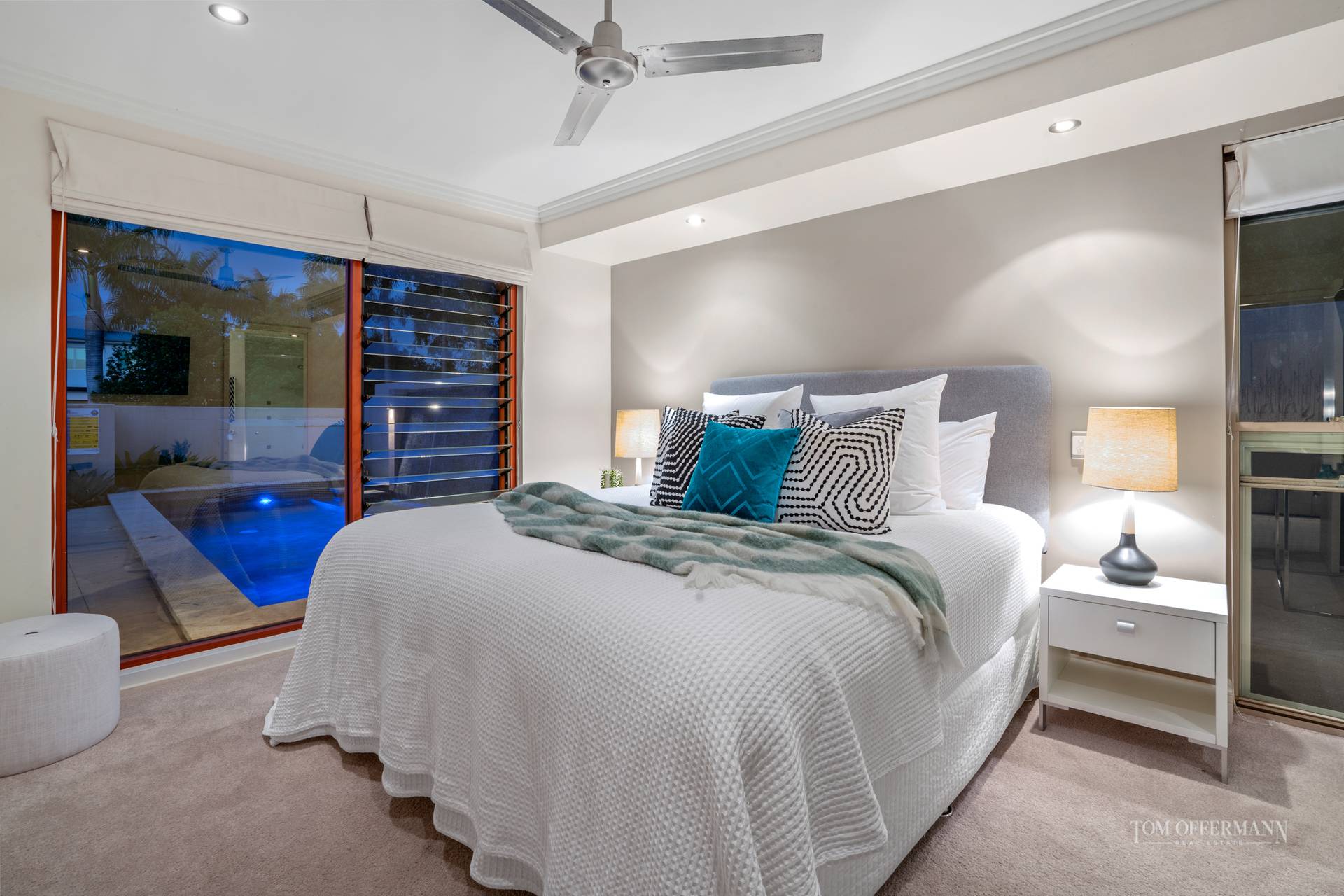 Banks of glass louvres throughout are efficient breezeways, however taking it next level is the auto Vergola system over the courtyard. Open the bi-fold doors of the dining space and it takes on a fabulous alfresco entertaining alternative. In addition, when the privacy fence is retracted there are interrupted views of Seahorse Park, plus a gate in the wrought fence is handy for kids wanting the check out the giant Ficus trees with branches almost draping the ground.