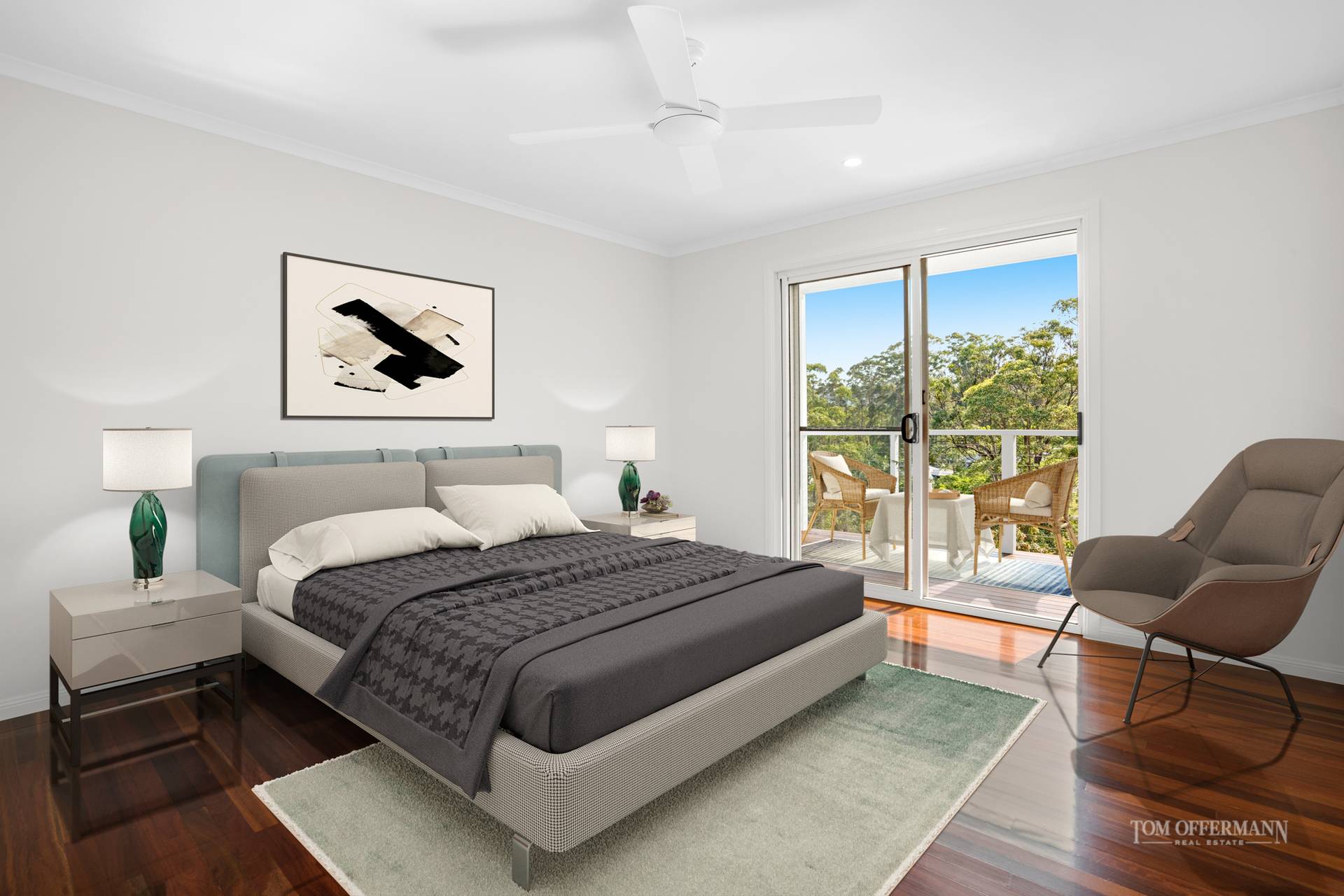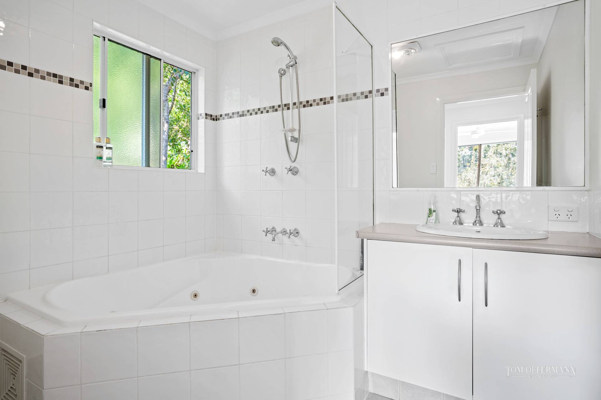 With 3 double bedrooms, the master suite is located on the second floor and has a walk in robe, ensuite and doors to a covered balcony. Windows, screens and fans ensure a cooling breeze throughout. The master suite occupies the entire second level and has a chapel ceiling lounge, library or home office giving the area a great sense of separation and retreat for parents. Wake from sleep to the green tree top vista and sound of birds. Perfect.