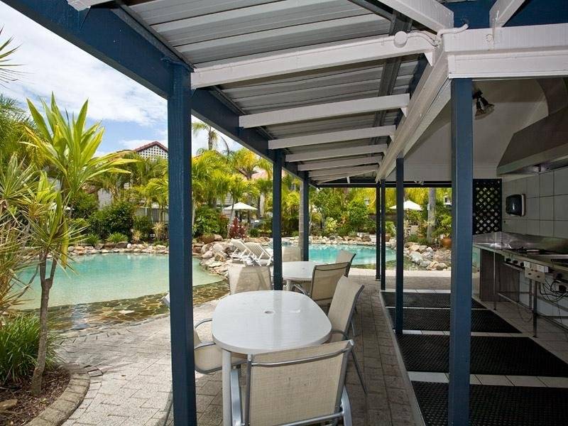 The spacious private courtyard opens into the free-form resort pool and spa which is adjoined by the covered barbeque area.