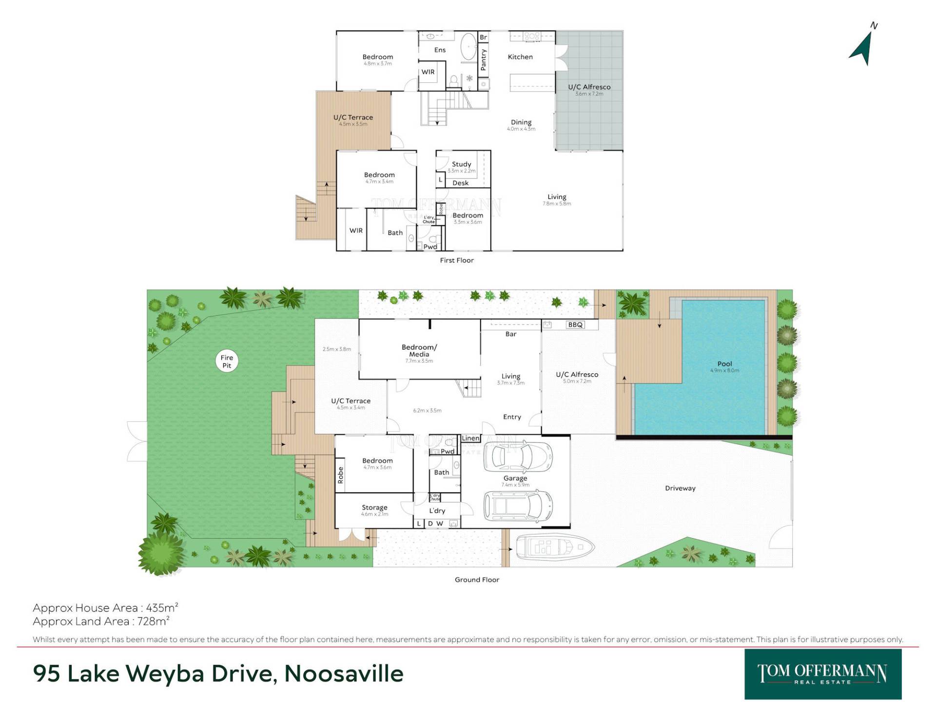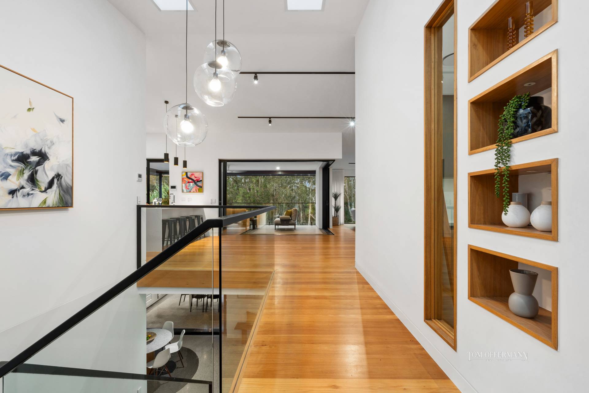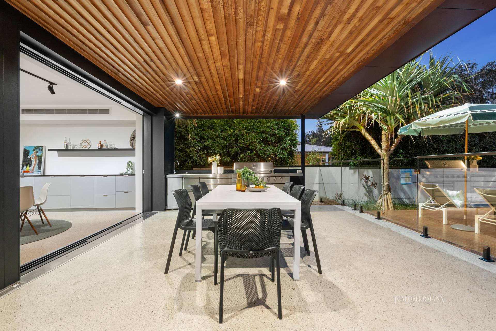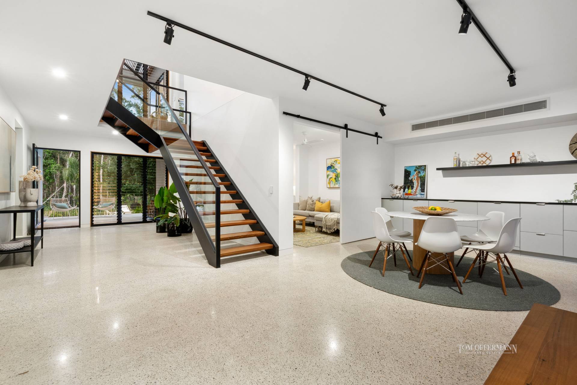 • About: white polished concrete flooring downstairs; cedar timber exterior walls & alfresco ceilings; blackbutt timber treads & flooring upstairs; designer pendant in void; vaulted ceilings; ducted air/fans; louvres/skylights/disappearing doors; upstairs living & dining w absolute seamless connection to NE undercover terrace & 180-degree view of Weyba waterways & foreshore; downstairs casual living w custom bar opens to alfresco kitchen, BBQ & sundeck poolside; media/leisure/retreat; 5-bedrooms – upstairs carpeted premier king w access to rear terrace, WIR, ensuite w timber & basin-topped cabinetry, white kit kat wall tiles + bathtub; bunk room w WIR; bedroom 3 w BIR; bathroom & powder room; study w custom cabinetry; lower level bedroom/media/leisure room w access to terrace & garden; bunkroom w BIR; bathroom & powder room