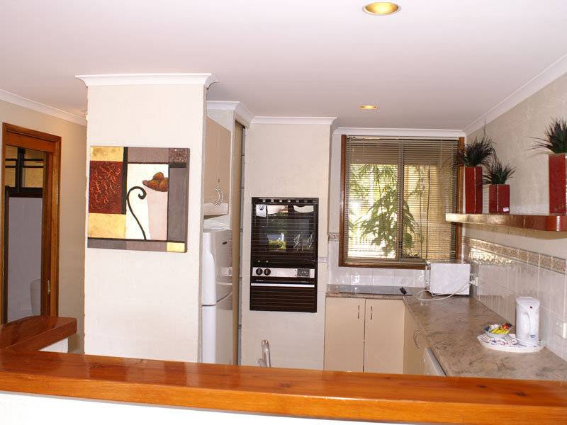 Timber beams and shutters opening from the living area to the waterfront patio complement the timber breakfast bar of the newly renovated kitchen, which has new white goods - as does the laundry.