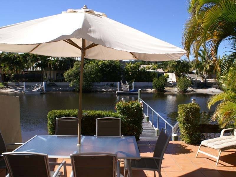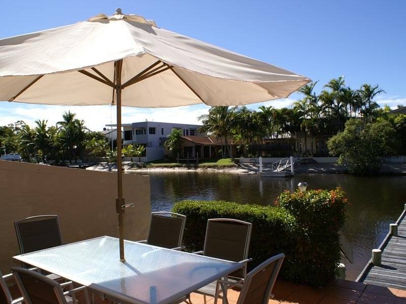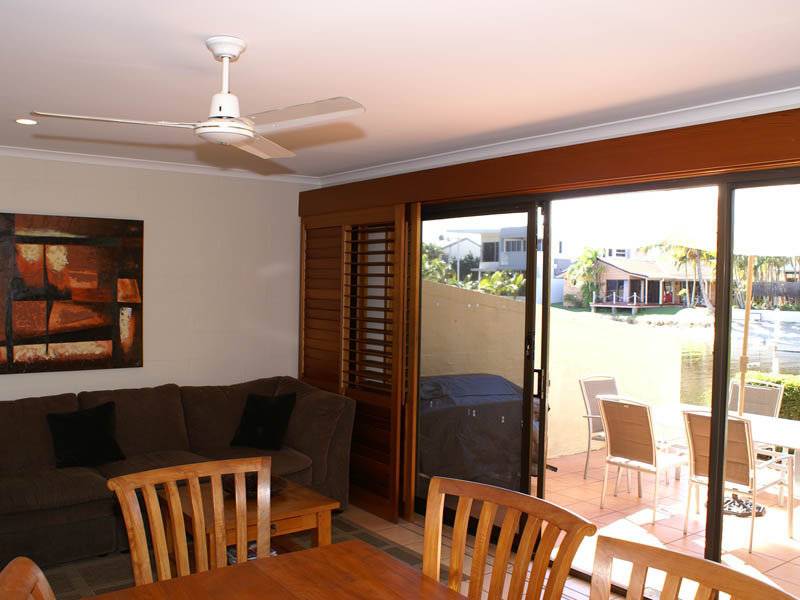 The east-facing waterfront patio that extends from the interior living areas of the solid brick townhouse catches the early morning sun - an idyllic place for spending some quiet time, with views across the canal and along the Noosa River to the green backdrop of Hideaway Island.