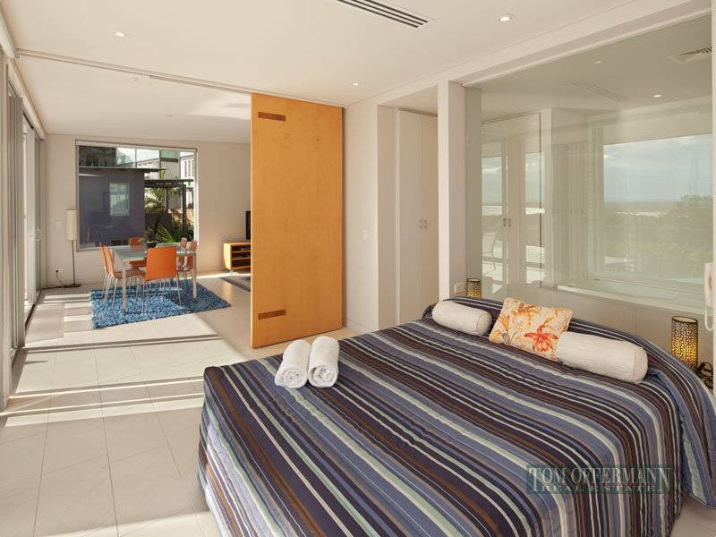 The lounge and dining areas open through glass sliding doors to the balcony, where white shutter doors fold back to reveal gorgeous views. Views that are also captured from the main bedroom that opens to the same expansive balcony.