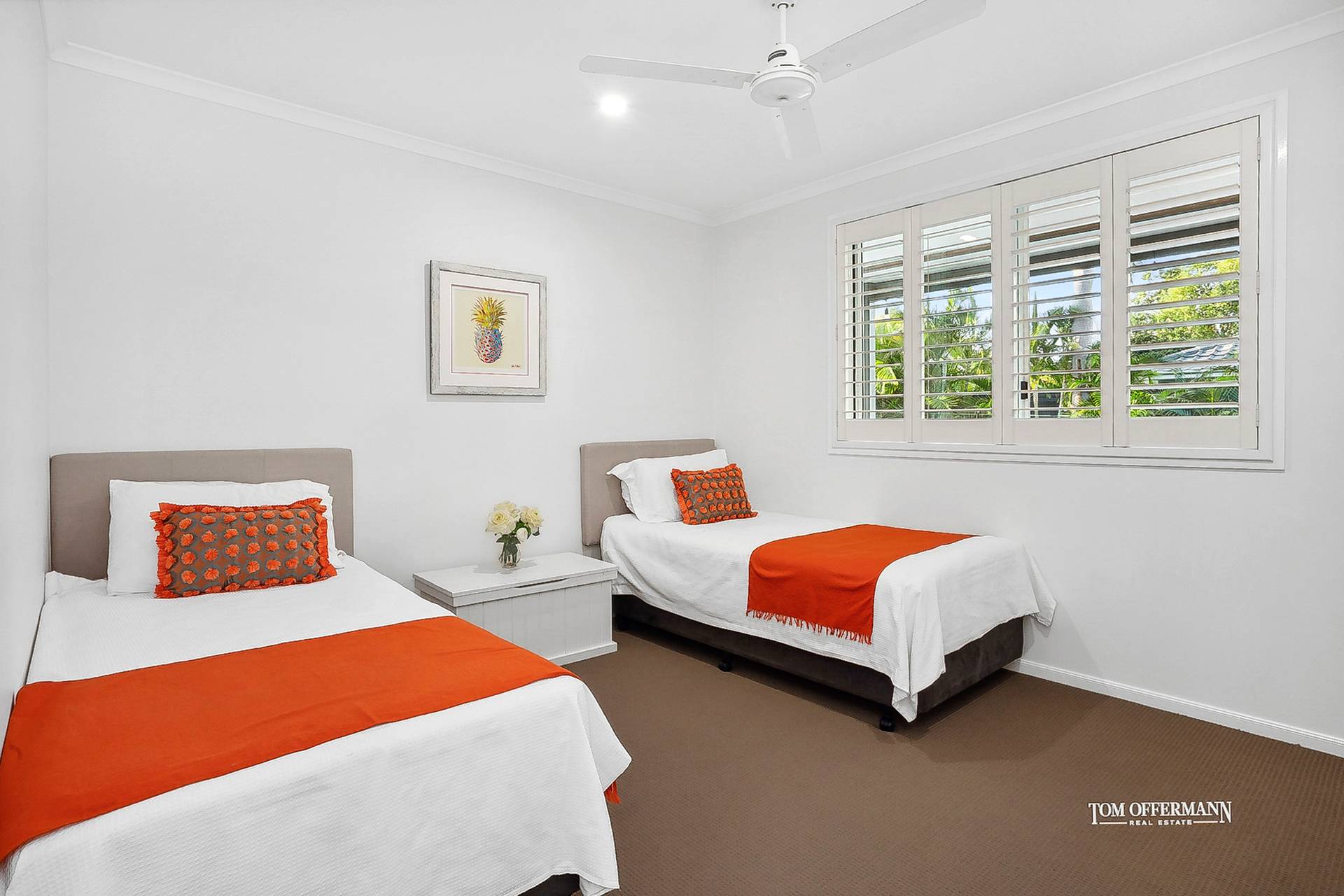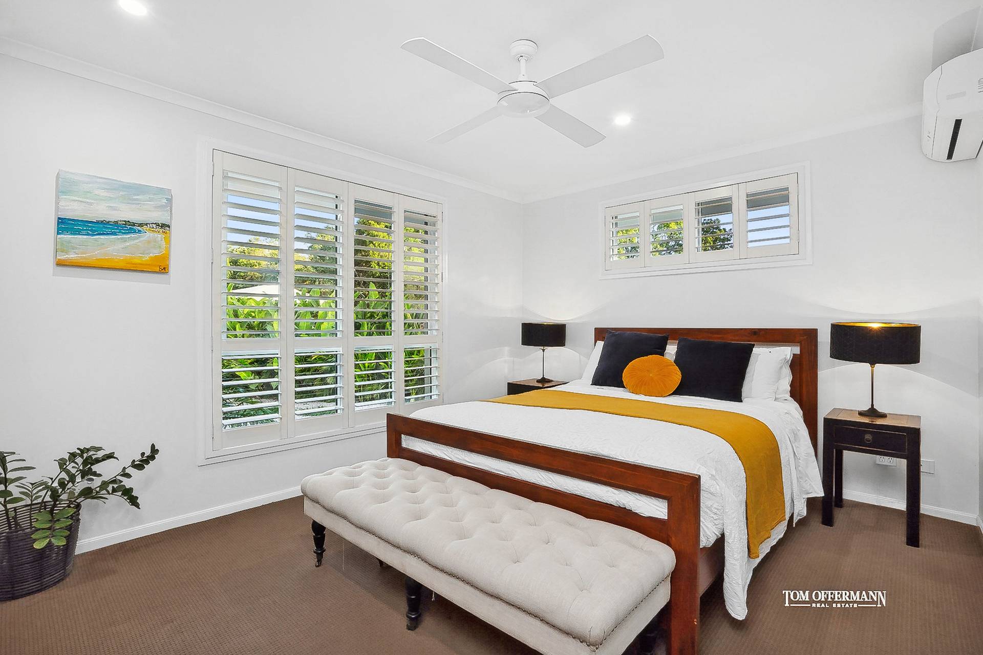 - About: natural-hued tiled flooring most areas; plantation shutters/blinds; aircon/fans; 2-car+ garage w storage; carpeted lounge w shutters/louvres to front garden; living/leisure space opens to northerly main undercover alfresco terrace + cabana w daybed from west side; 4-carpeted bedrooms - premier king suite w 2xWIRs, looks out to front garden, ensuite w long white stone/basin topped cabinetry; 3 bedrooms w BIRs share bathroom w white basin-topped cabinetry & bathtub