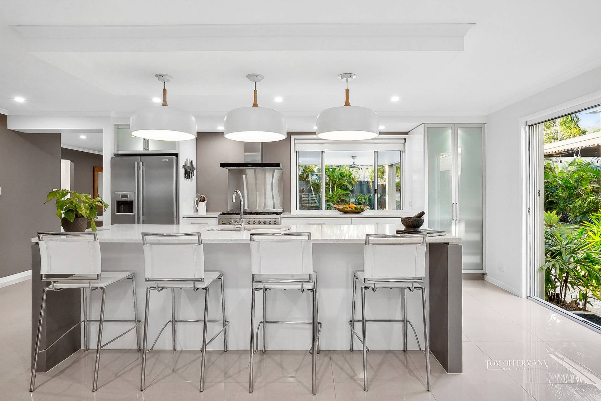 Being big on living space indoors and out, necessitates a kitchen for the super-keen entertainer. No disappointment here with its galley-style, white stone-topped cabinetry, serious island breakfast bar with designer pendants, walk-in pantry, latest high-end appliances including six-burner gas hob, and views to the pool area.