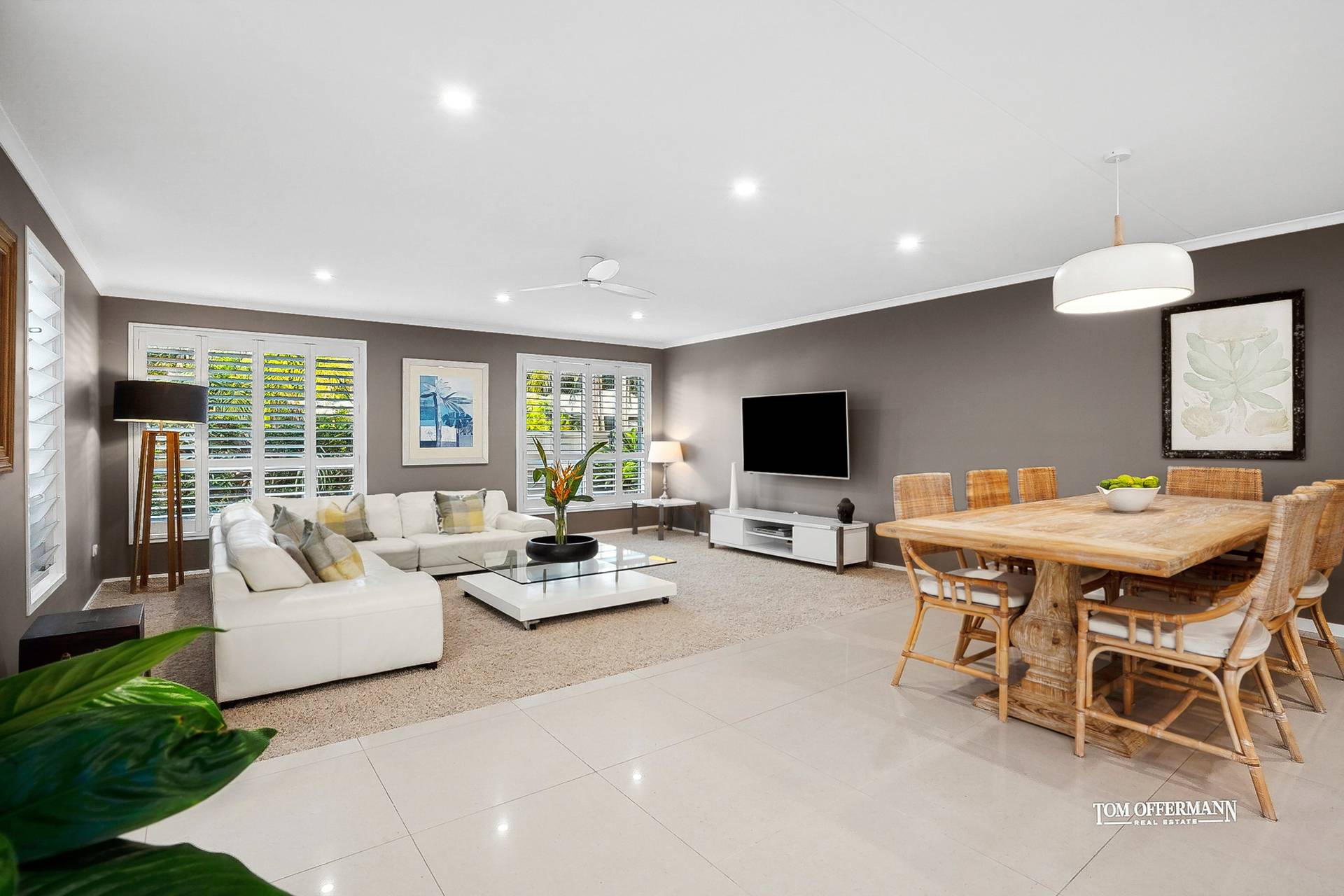 Inside, capturing the imagination of a flawless family lifestyle is the open plan living space, with a monochromatic aesthetic and beautiful natural-hued tiled flooring. The over-generous lounge area with picture windows and white plantation shutters looks out to the pebbled front garden. The dining area suggests family dinners are de rigueur.