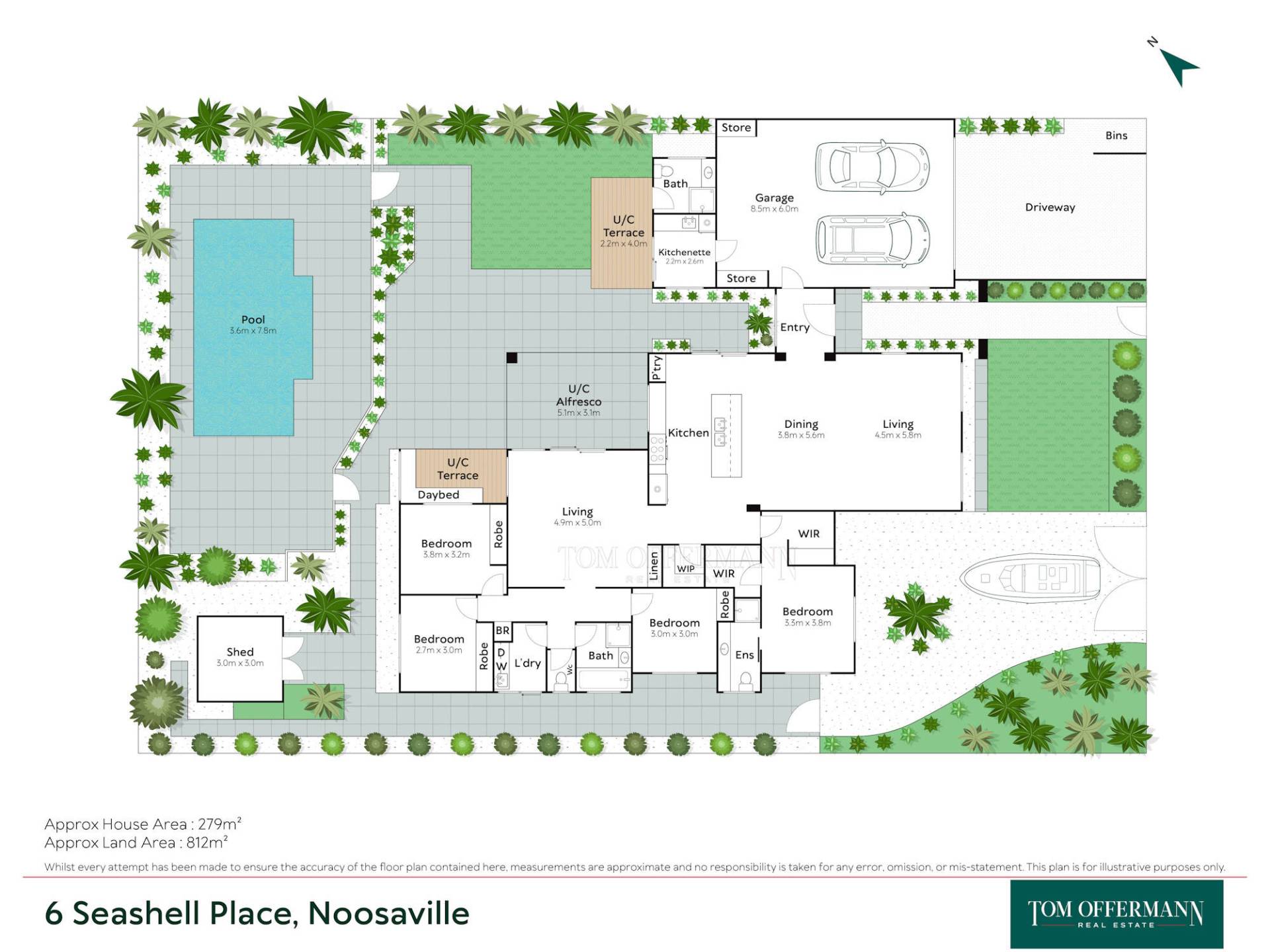 - Pool/Terraces: 3.6mx7.8m surrounded by sandstone paving / 5.1mx3.1m main undercover; 2.2mx4m undercover abutting lawn, kitchenette & bathroom