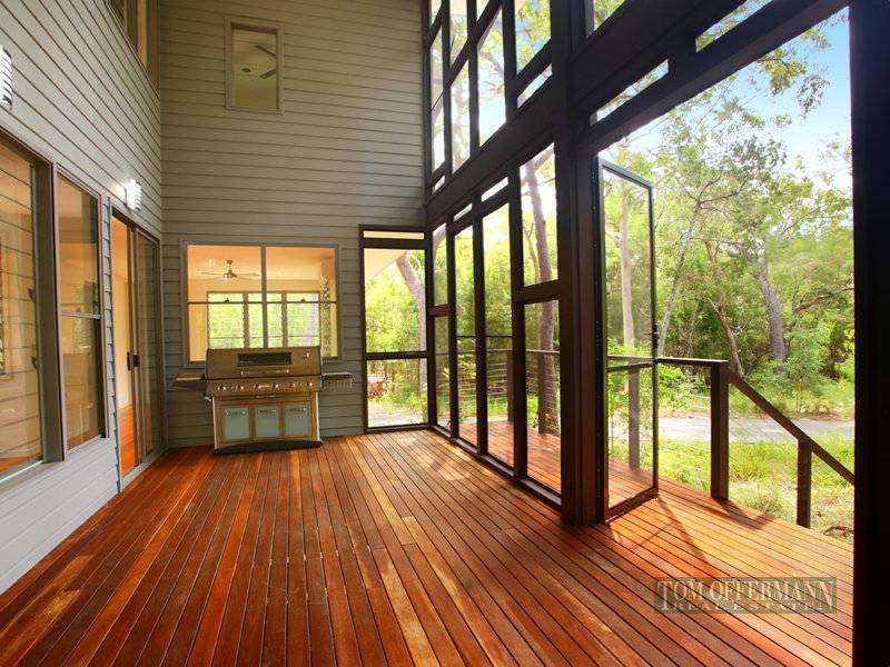 Featuring a massive central screened deck on the ground level, from which all other living areas radiate, the heart of this home truly invites the outdoors in. The double height deck captures breezes and facilitates natural cross ventilation throughout the home's main living areas, as well as allowing an ideal amount of sunlight into the home.