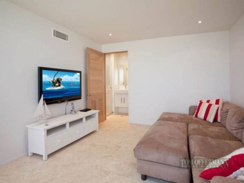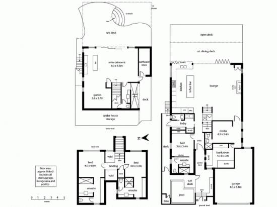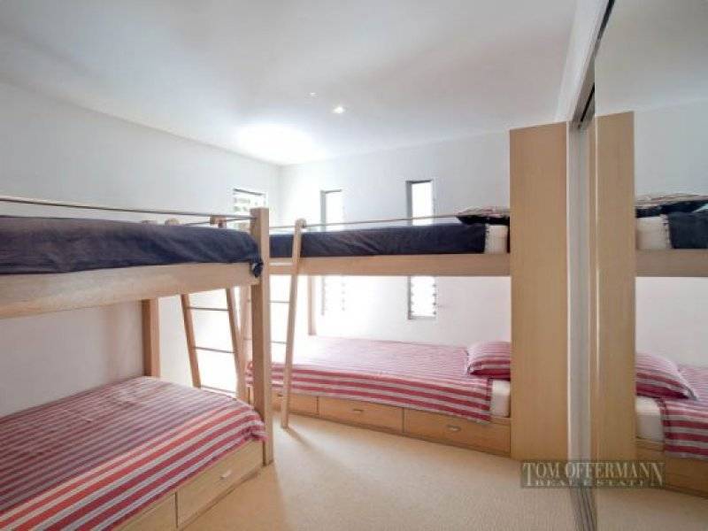 Accomodation offers on this level there is an ensuited bedroom to one wing and a delightful kids retreat with bunk room, adjoining rumpus/media room and full bathroom. Two gorgeous double bedrooms with ensuites privately occupy the top floor. On the lower floor, a superb open living room has a large wet bar to one wall, media station and plenty of space for a pool table or further bedroom.