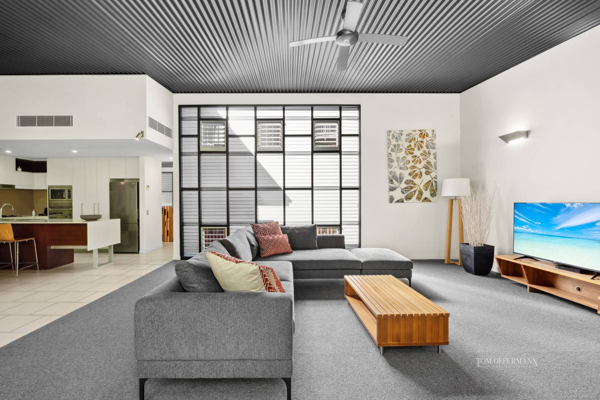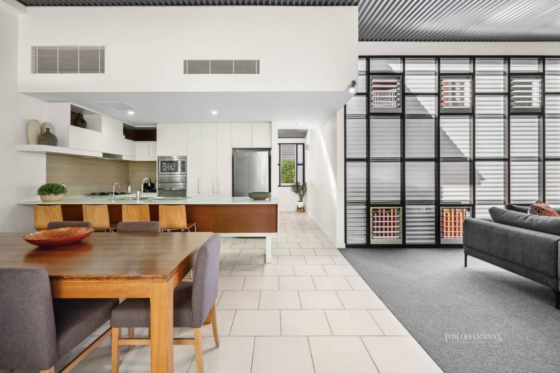 The front entry terrace, partially fringed by heliconias opens to reveal polished timber treads, sandstone-hued flooring, and a chic contemporary aesthetic. Admire the numerous hallmarks of architect John Mainwaring such as lofty corrugated ceilings in the generous living spaces, complemented by an entire wall featuring timber framed panes of translucent corrugation and louvres, cleverly designed to capture abundant filtered northerly light.