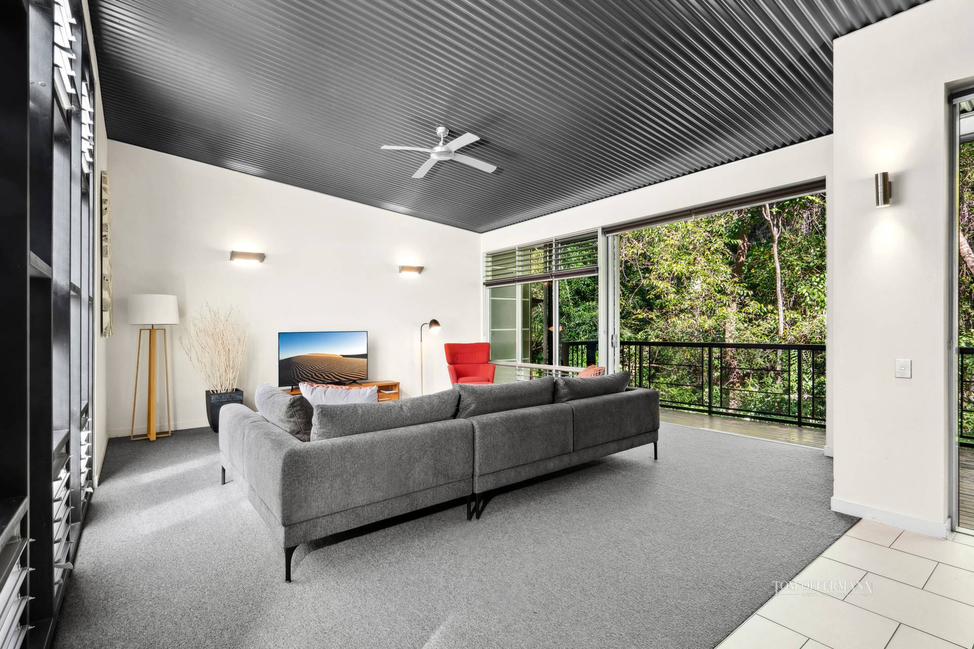 - About: terrace w heliconias to front entrance from lane & 2 car garage; 3-levels; sandstone-hued flooring & timber treads; fans/aircon; contemporary aesthetic & monochromatic palette mimic outdoors; corrugated ceilings & feature wall w timber framed panes of translucent corrugation & louvres w NE aspect; doors/louvres to terrace w SW outlook over & into rainforest incl freshwater creek; carpeted living w slate grey modular sofa & ottoman; splashes of colour w armchair & ottoman, cushions & large artworks; timber coffee table & console w Smart TV; timber dining table w 6 fabric covered chairs; tall doors open to terraces w glass-topped dining table & 6 rattan chairs