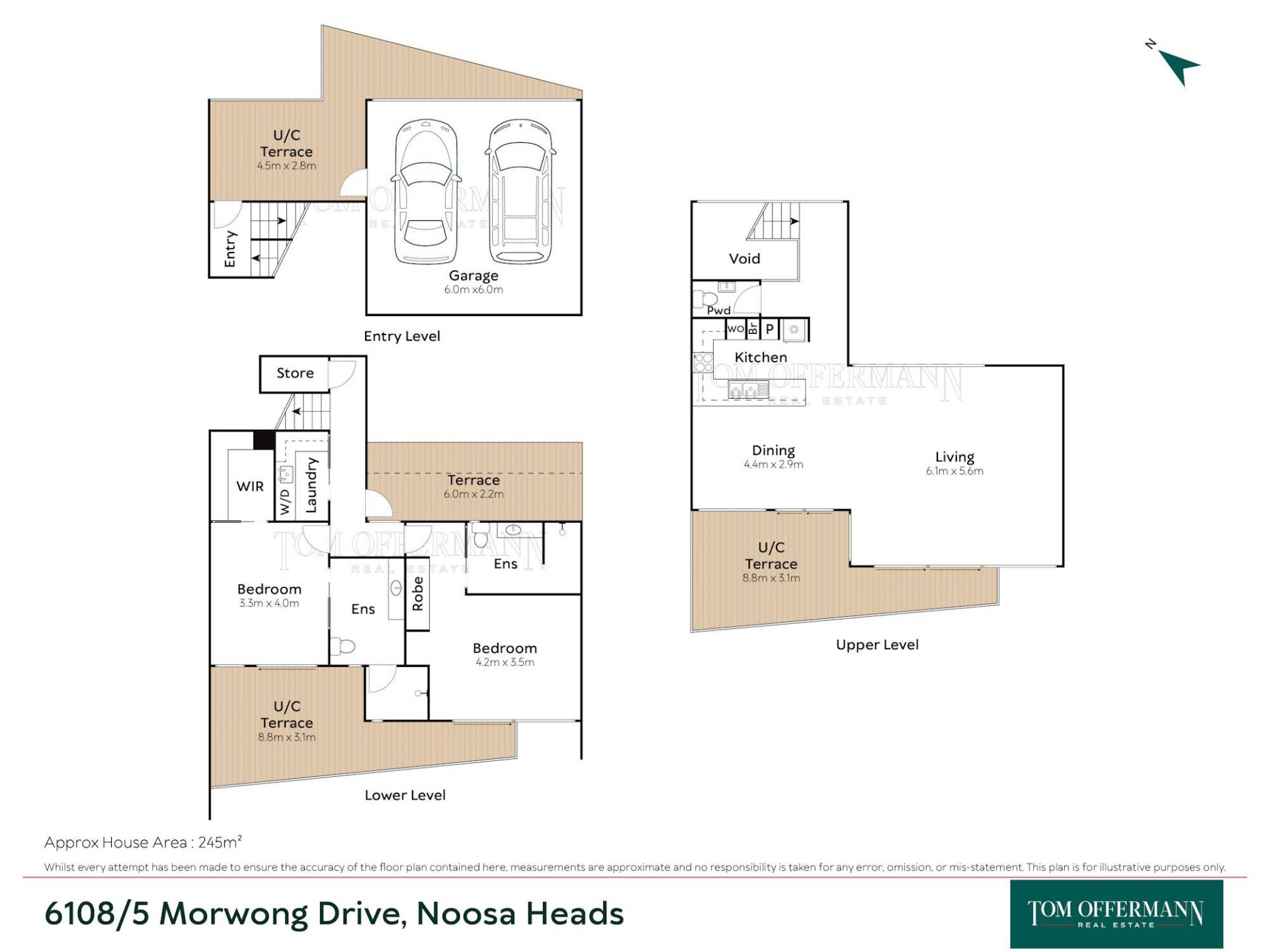 - Terraces: upper level 8.8mx3.1m undercover off living & dining, 8.8mx3.1m lower-level undercover off bedrooms