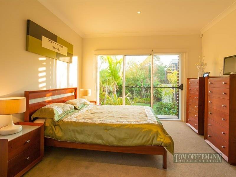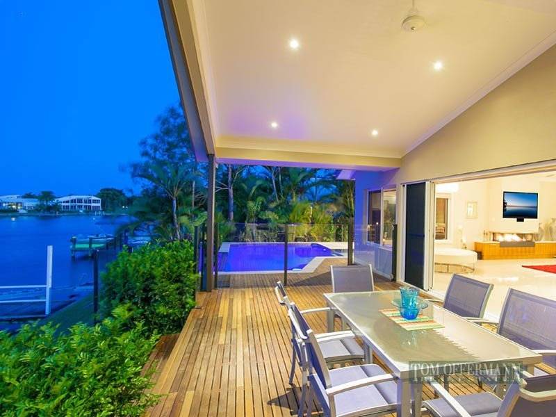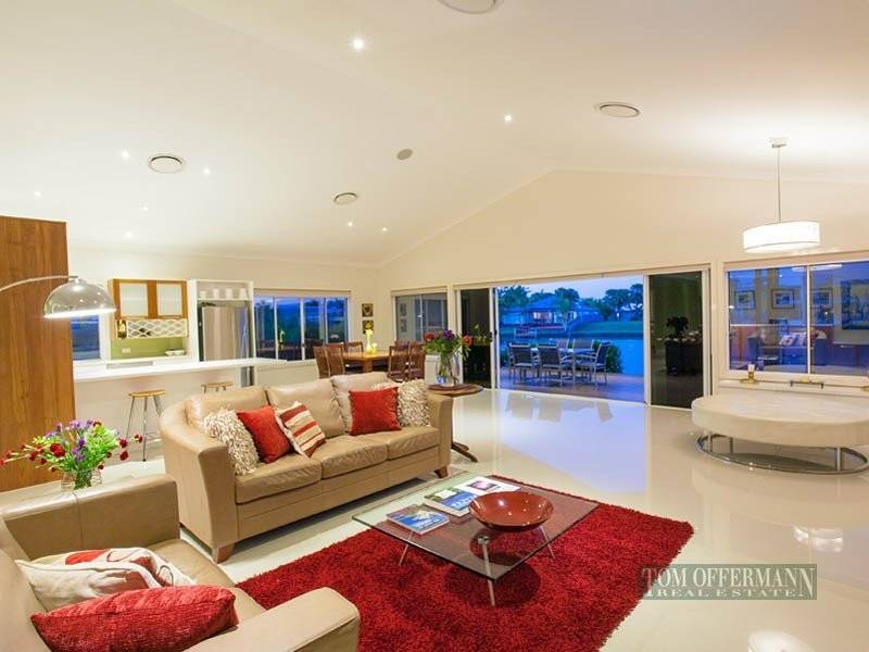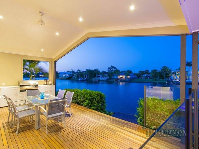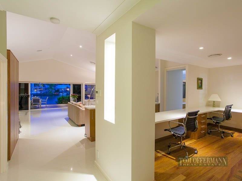 This single level canal home provides a tranquil ambience from the luscious tropical courtyard entry to the canal-side sparkling pool, covered terrace, jetty and boat ramp. In between there's inspiration at every turn, craftsman built and individually designed double entry doors and interior cabinetry, a wide welcoming foyer, unique raised floor home office with water views, open plan living and an exquisite gas fire. The vaulted ceilings and a multitude of glass and louvers maintain a light and airy feel throughout. The accommodation caters perfectly for both family and guests with good separation between the 5-star master suite, other bedrooms, guest suite and living areas.