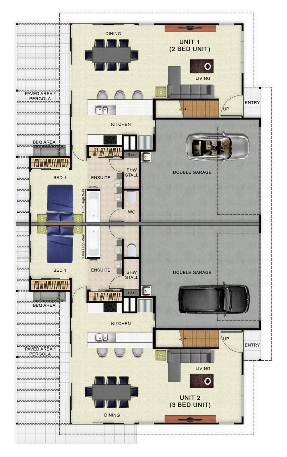 The open plan layout with gourmet kitchen at its heart offers seamless indoor/outdoor living on one level, wheelchair accessible ground floor master bedrooms with ensuite, it's own private spacious courtyard and double garage with internal access. Additional bedrooms and bathroom are upstairs.