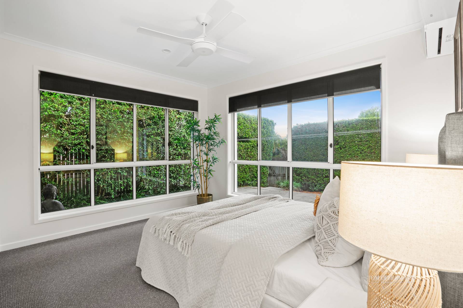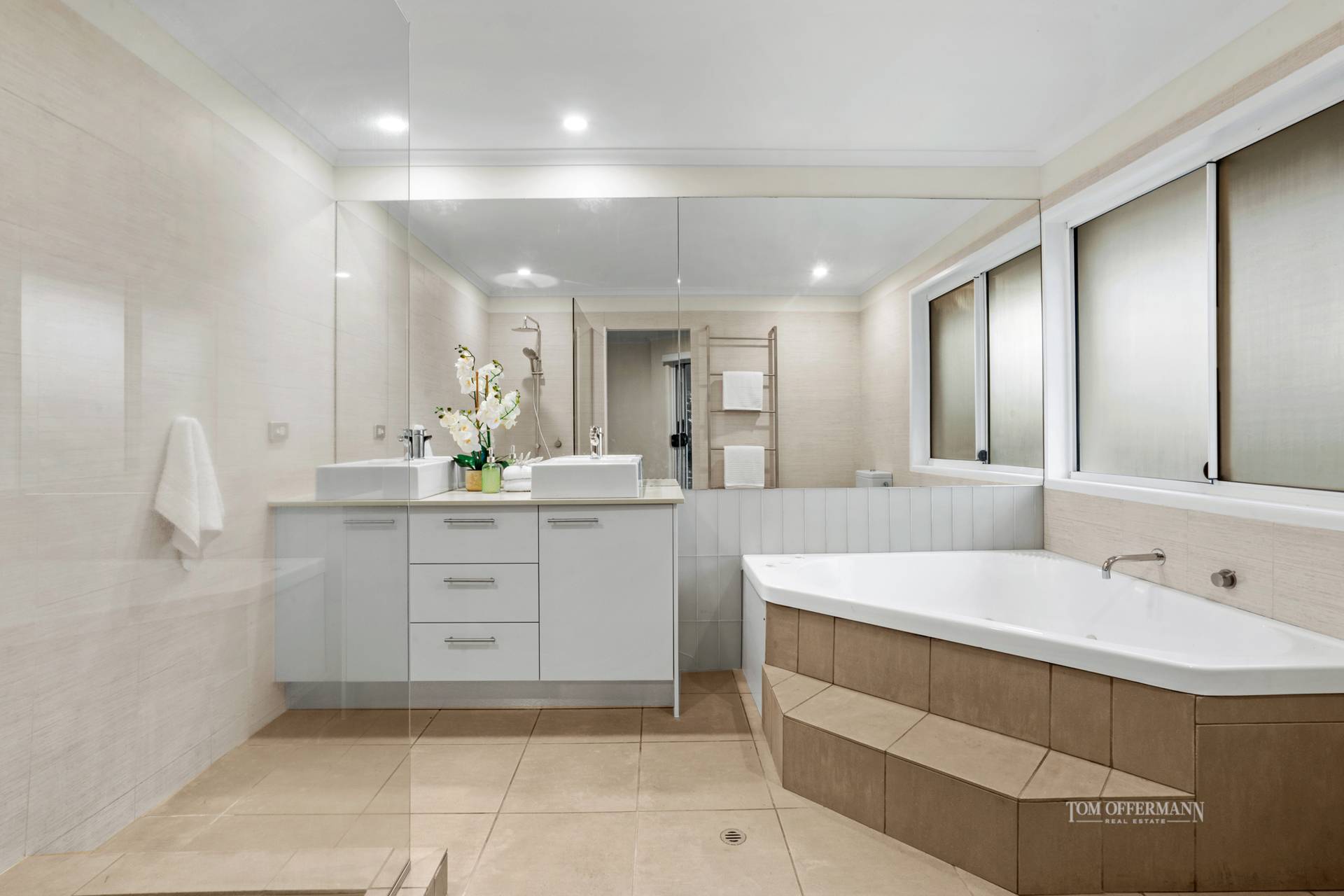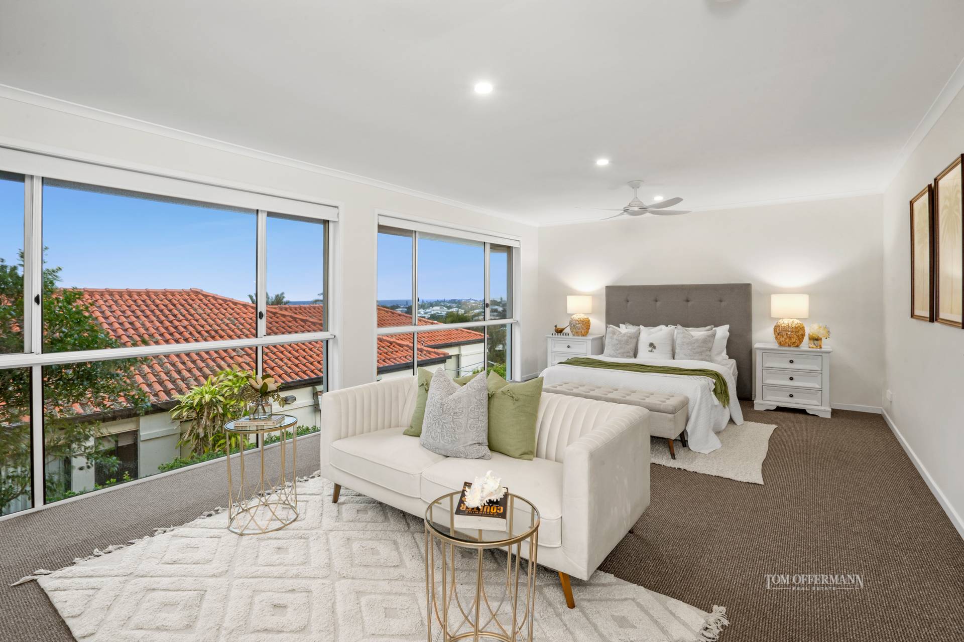 There are five carpeted bedrooms. Upstairs the whole floor is given over to the premier king retreat with dedicated sitting area, north-facing terrace and Coral Sea views, plus ensuite with spa bath, also a walk-in robe. Downstairs are four bedrooms with built-in robes, two bathrooms, one also kitted out with the laundry, plus there are two separate toilets.