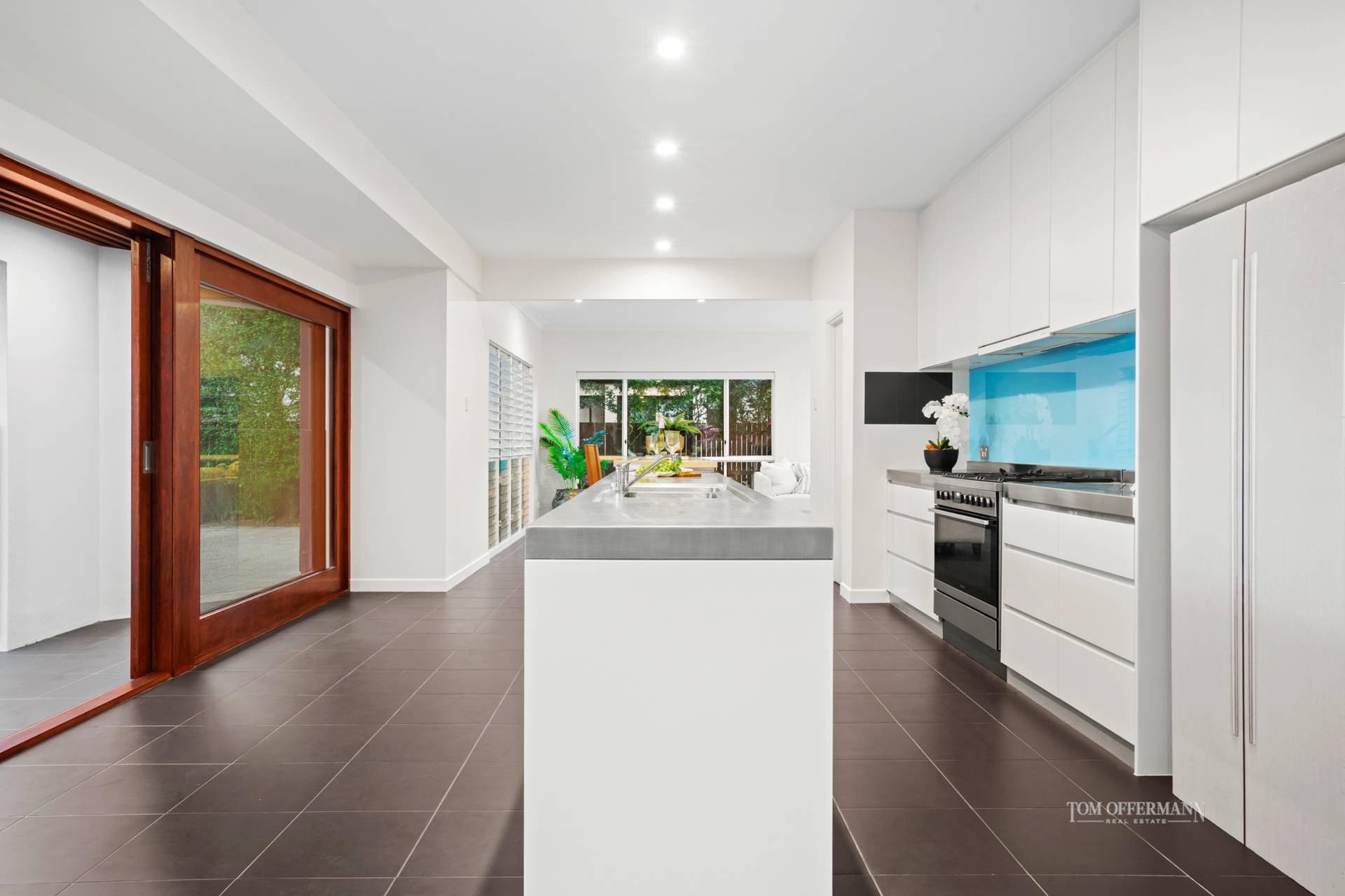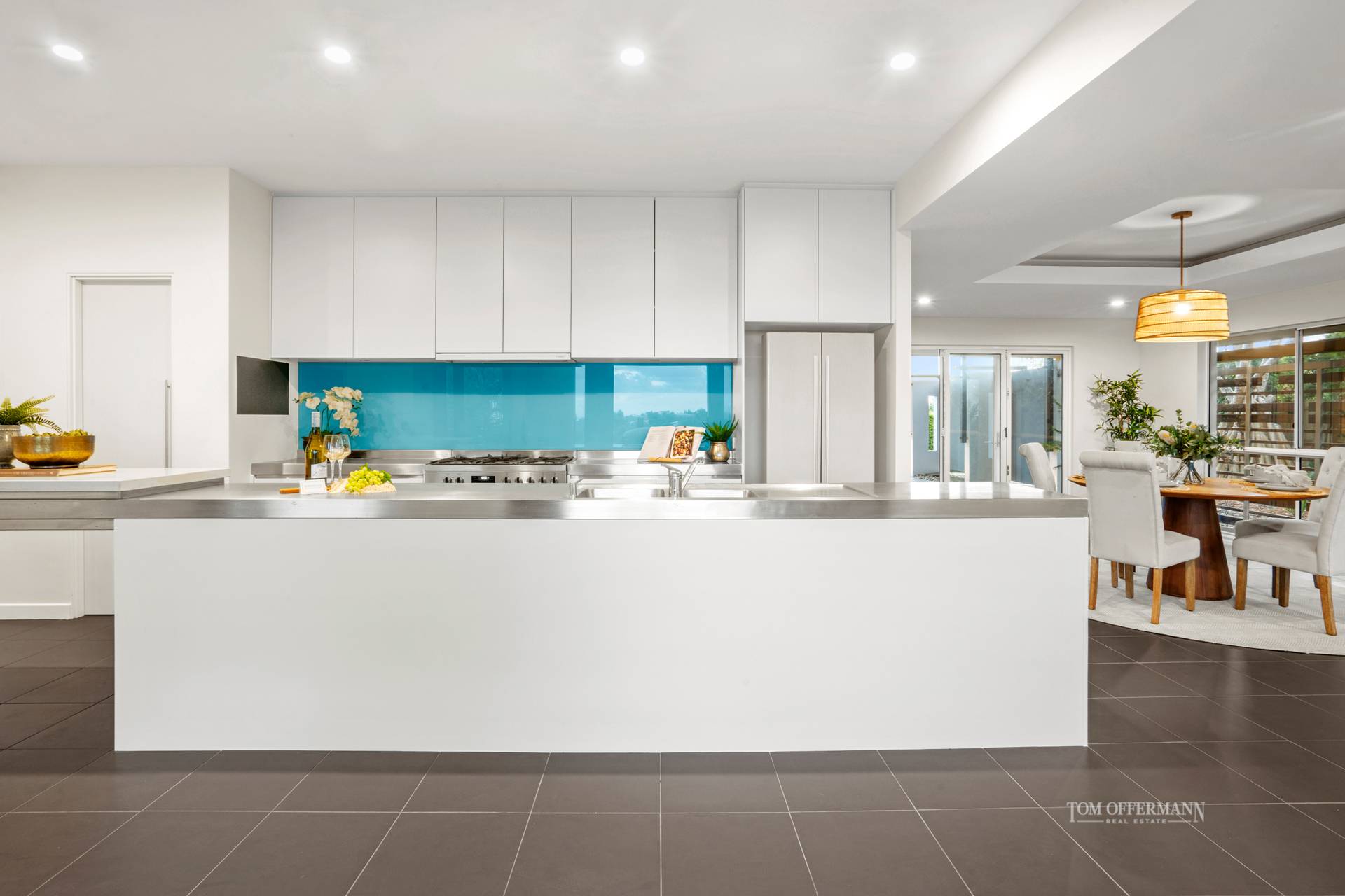 With an abundance of entertaining options, it's essential to have a kitchen commensurate in size and functionality. It's galley-style including island with lengthy stainless steel-topped cabinetry plus it has a stone-topped breakfast bar extension, also pretty blue glass splashback, walk-in pantry and all the necessary whizz-bang appliances.