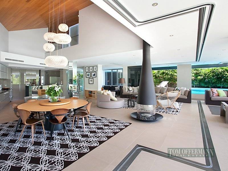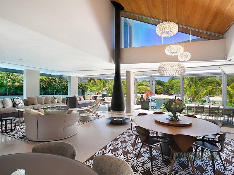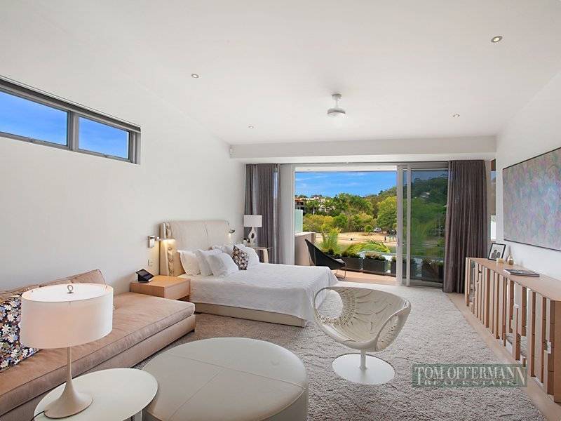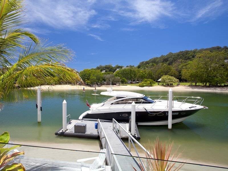 The sophisticated two level residence enjoys the wash of light and track of the sun captured by a north eastern aspect across waterfront terraces, beach side decks and luxuriously styled bedroom suites. Lush palms rise from sandstone edged rocky ponds in the private entry courtyard, a glass main door swings wide to open living domains, the seductive curve of walls and bulkheads subtly work their way around the sleek lines of the pool, frameless glass automated doors engage waterfront terraces and sails unfurl at the touch of a button. A superbly equipped kitchen links to a stainless outdoor barbecue and wood fired pizza oven, a gangplank connects to the private deepwater pontoon and this spectacular home adopts an open arm approach to all Noosa has to offer.