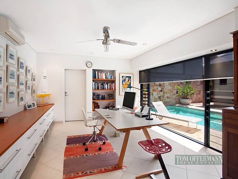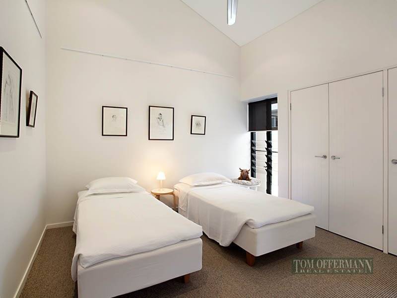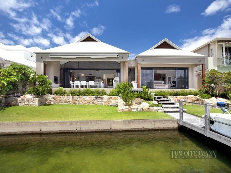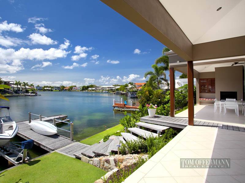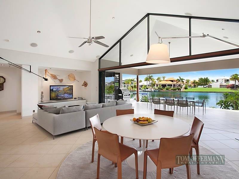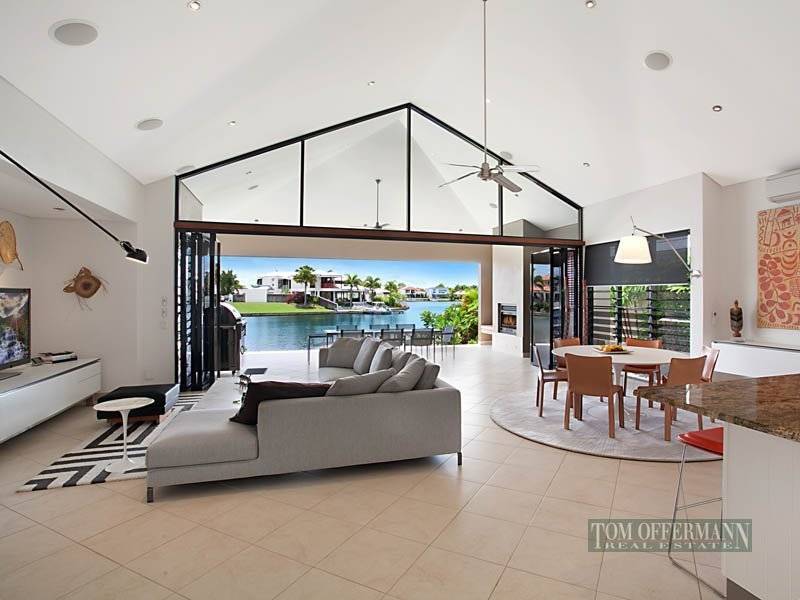 Lofty shadow line set ceilings follow the angle of steeply pitched rooflines and black powder coated frames dress windows and doors. A large double garage has lined loft storage with drop down ladder and plenty of room for extra equipment. The home wraps around a courtyard pool with integrated spa, sandstone boundary wall, water feature and white pebble surrounds. Sliding shutter doors secure an office or rumpus room with a distracting floor depth picture window to the pool. There is a poolside powder room and separate access to the main bedroom and adjoining ensuite. A wide hallway draws you to the waterfront living rooms and under roof full width terrace. Along one wing two sizeable bedrooms enjoy their own bathrooms and air-conditioning units.