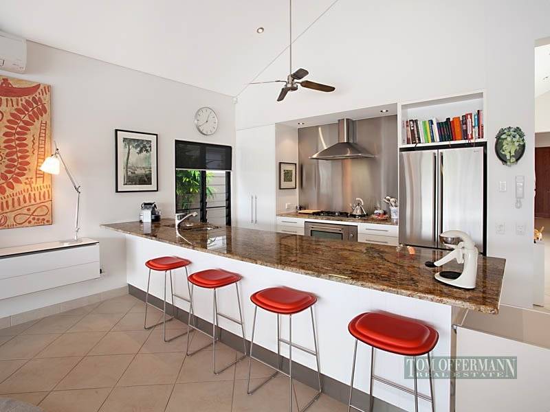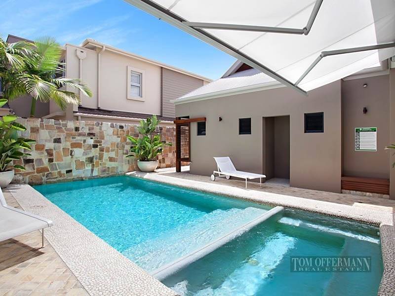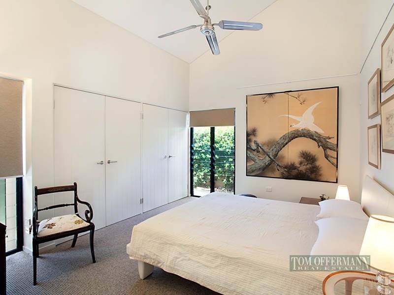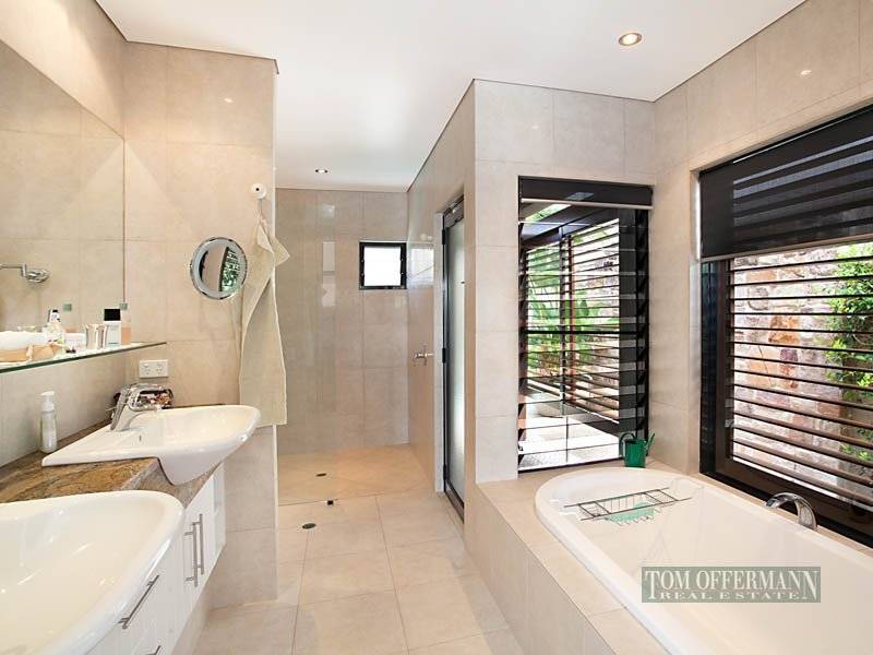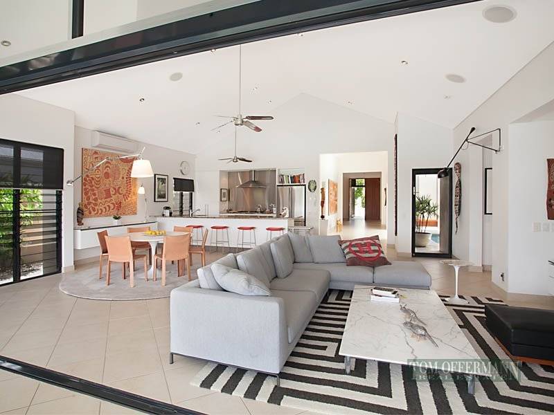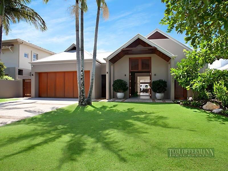 Striking a beautifully manicured pose to the street front and a fragrant edible garden to the waterfront, this substantial single level residence has a wonderful floor plan, distinctive style and relaxed sophistication. Rock solid rendered block construction in a deep mocha tone is a perfect foil for putting green quality lawns, lush border plantings and the rich patina of stained timber. Trio plantings of Alexandra palms, trailing jasmine, a coastal Tuckeroo and native gardenia frame the entry, while three plus metre high slatted doors secure a deep breezeway approach to the main door.