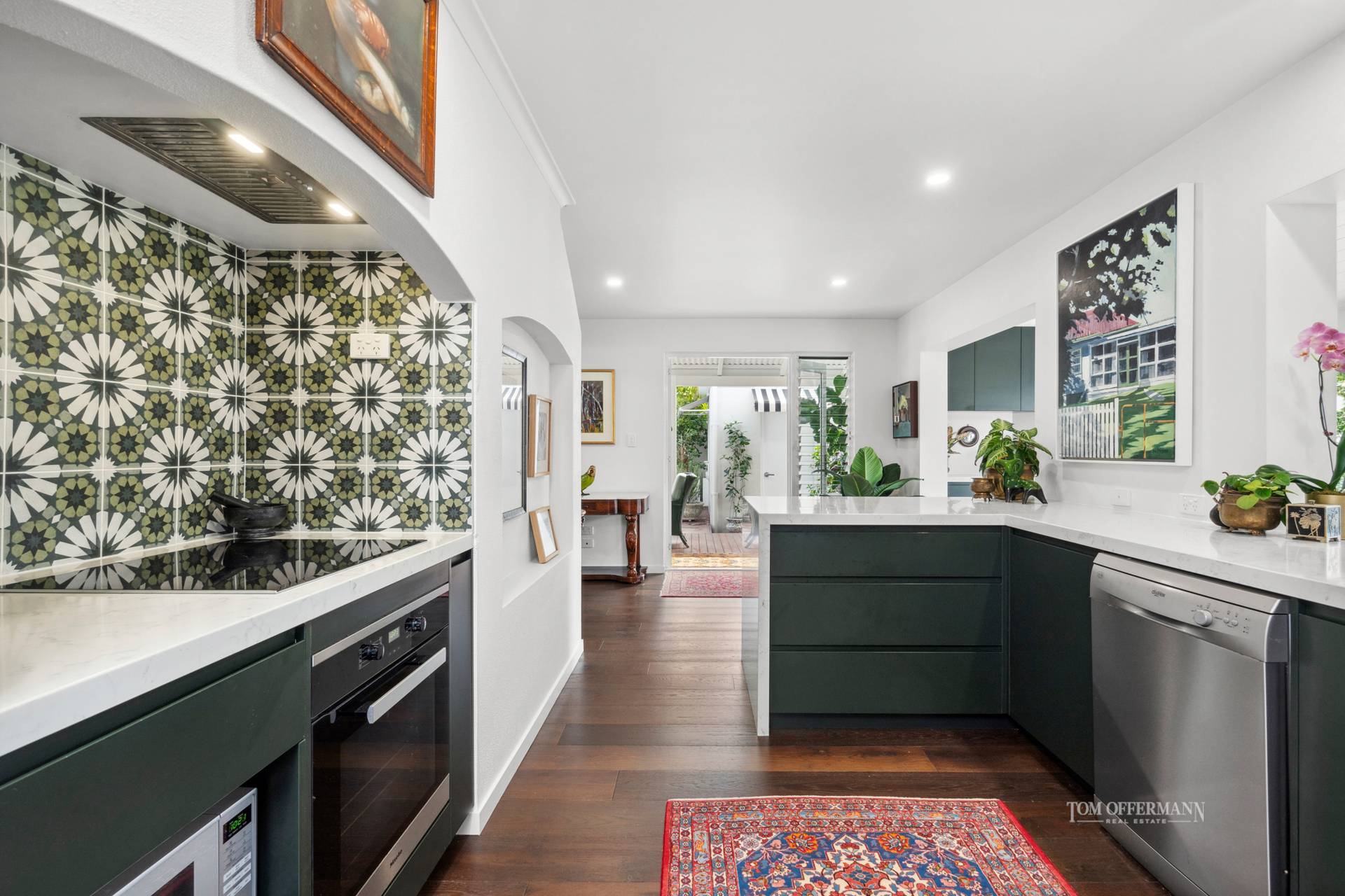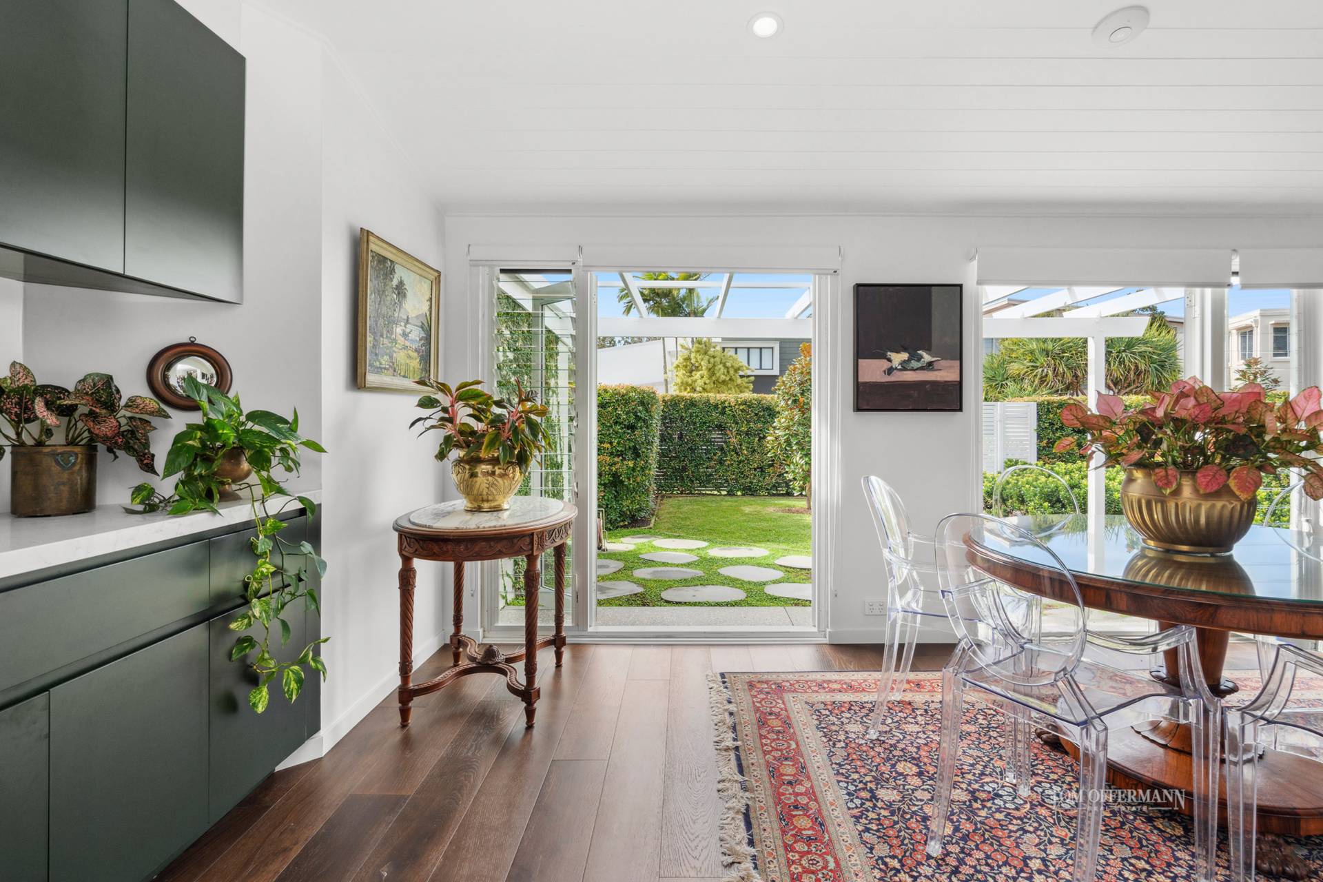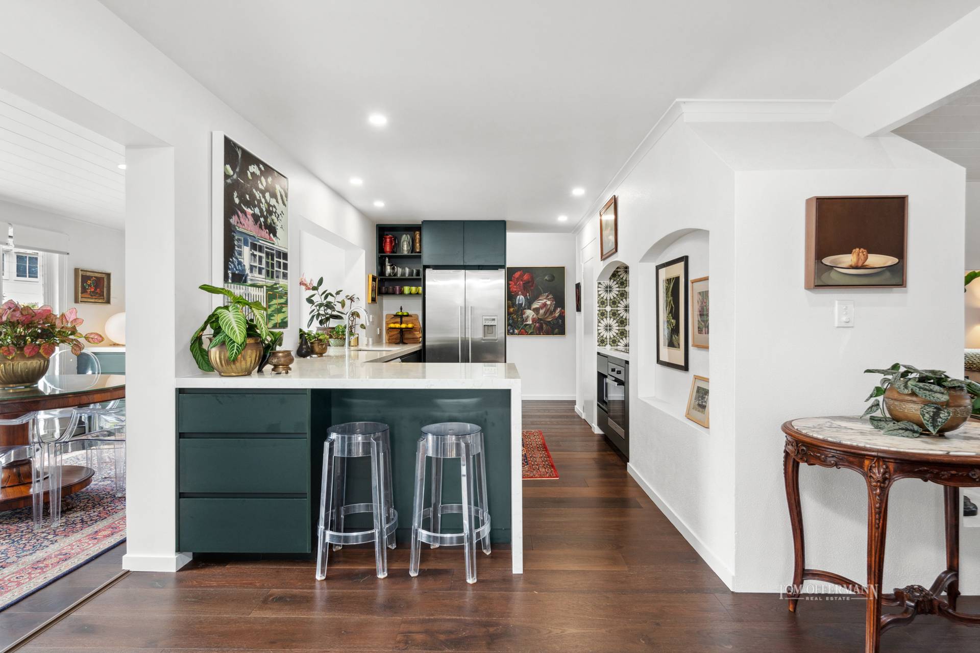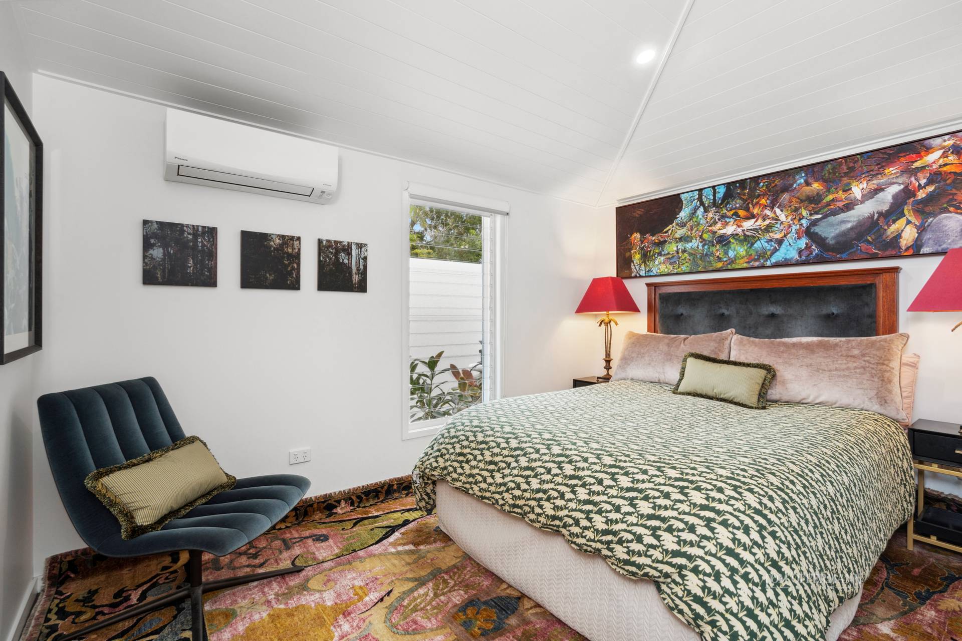 The galley-style kitchen has all the necessities needed for entertaining, including a servery to the dining room, which has glass doors opening into the front garden. In the south wing are two large bedrooms with walk-in robes. One opens out to the front garden, the second has a view of the side garden and both share a family-size bathroom.