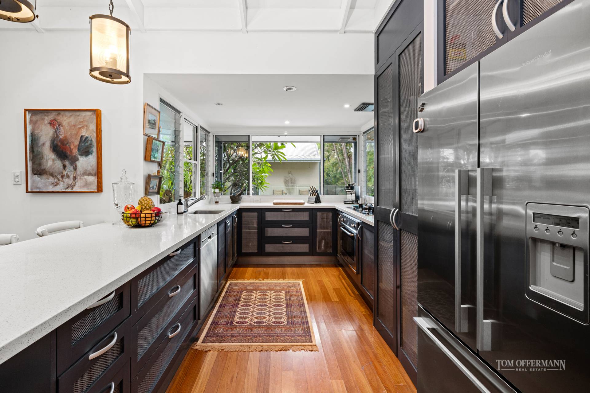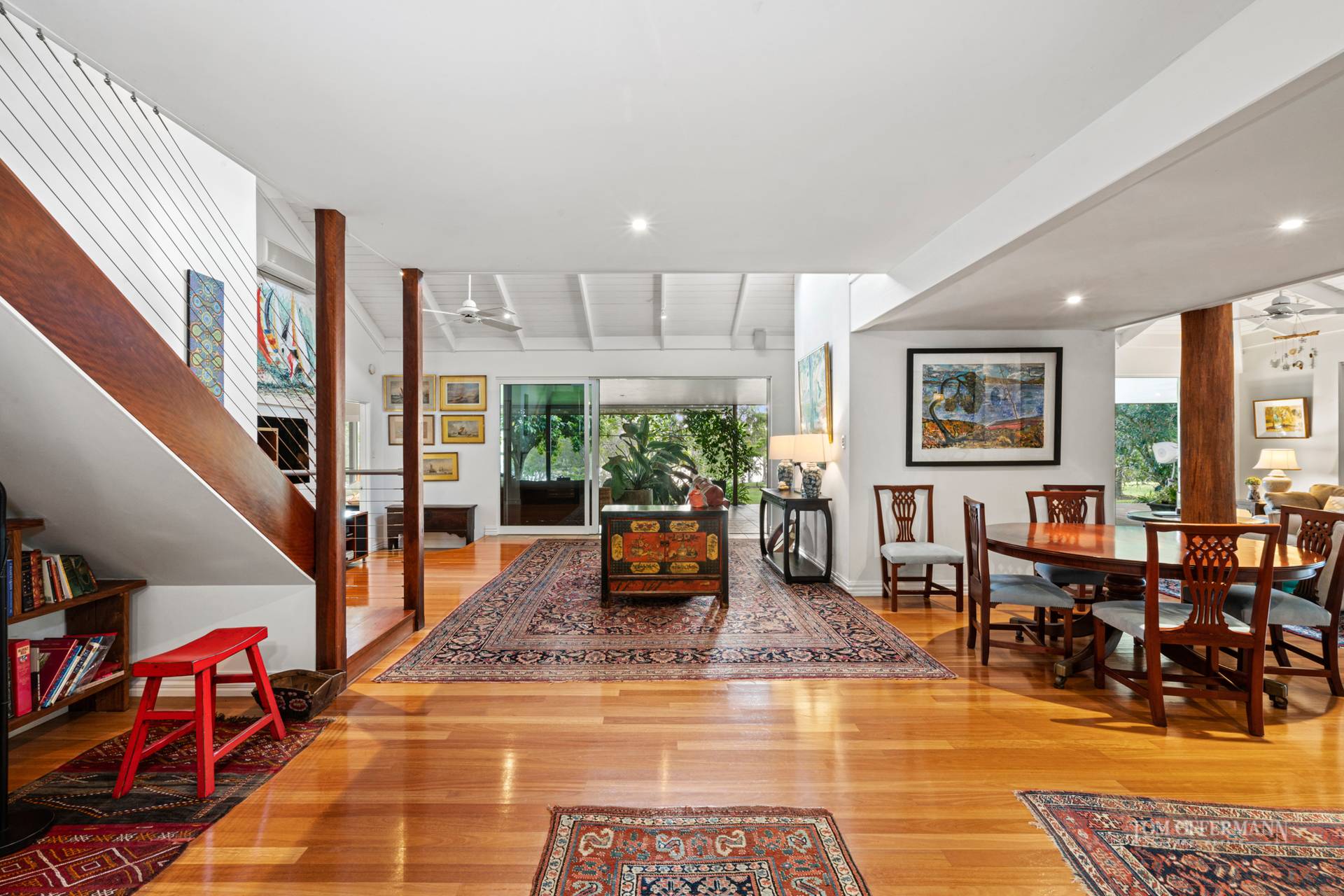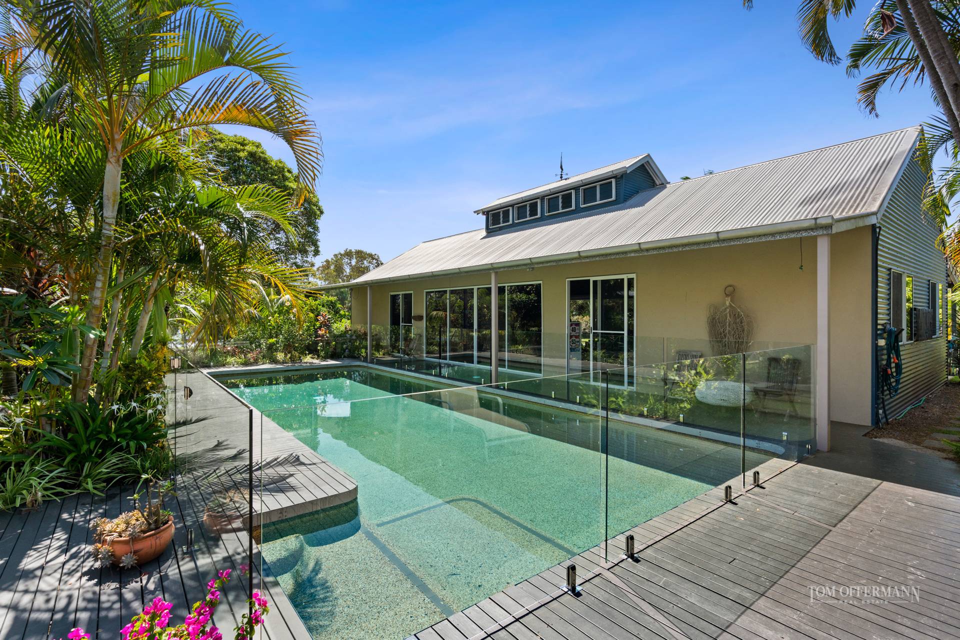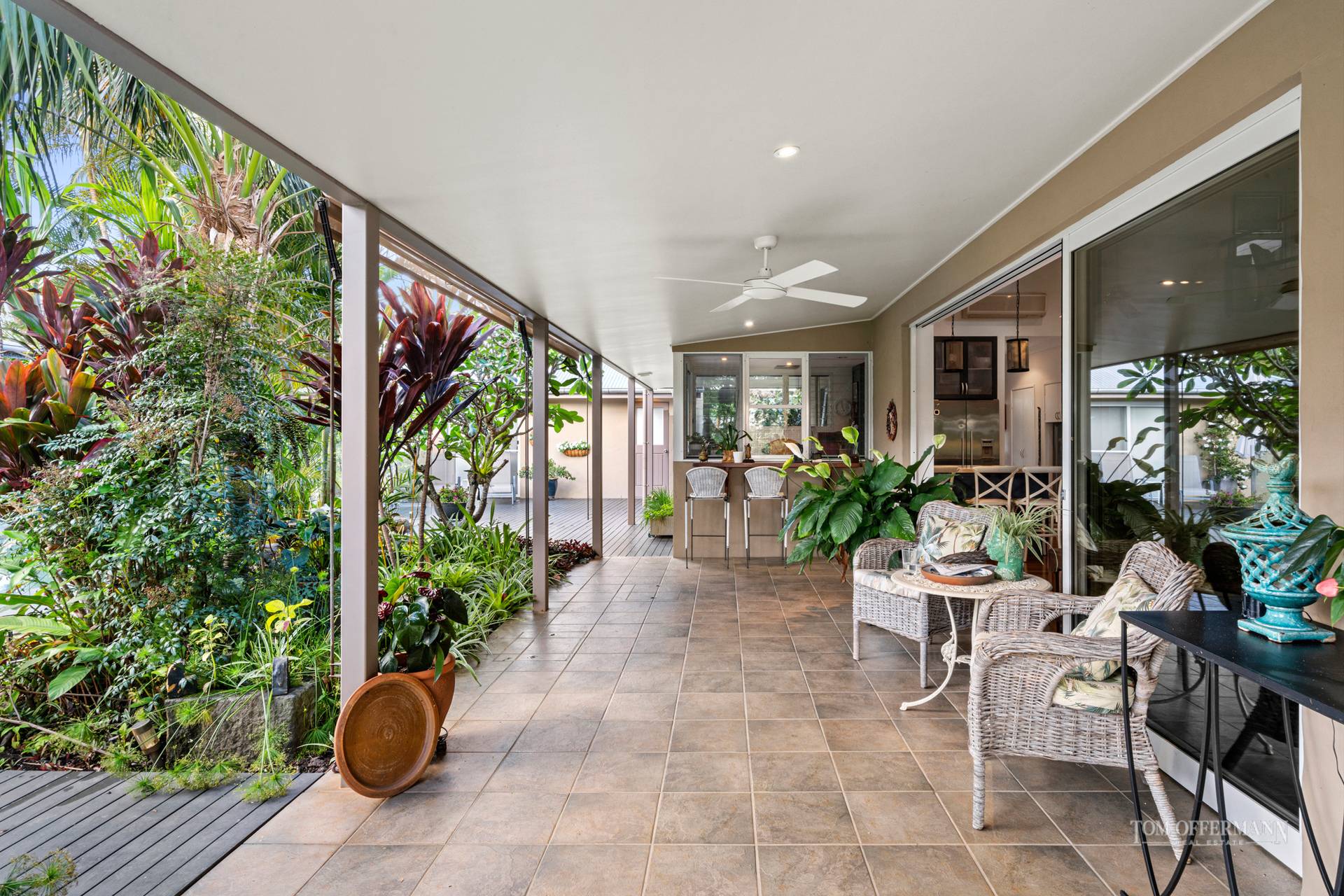 There is a delightful sense of arrival as you step from the vehicle and approach the large timber pivoting door formal entry. The home is cocooned in a sub-tropical wonderland of lush plantings created and nurtured by the present owners over two decades.