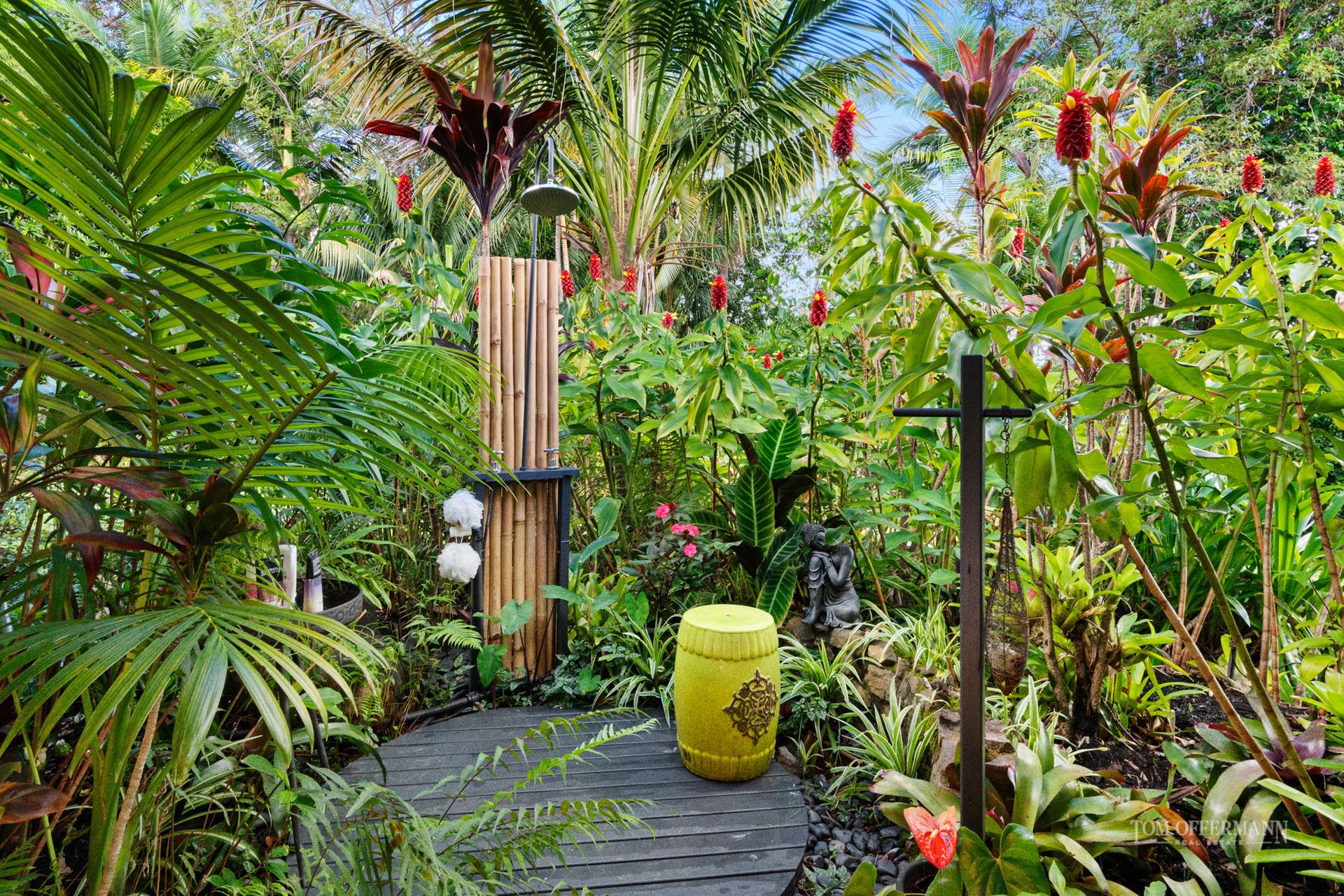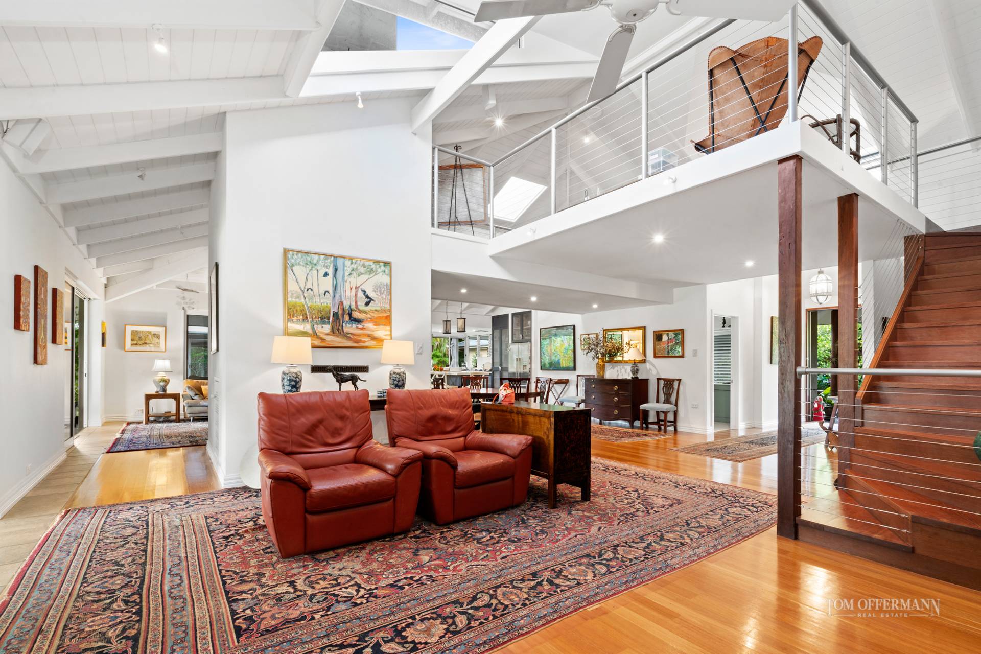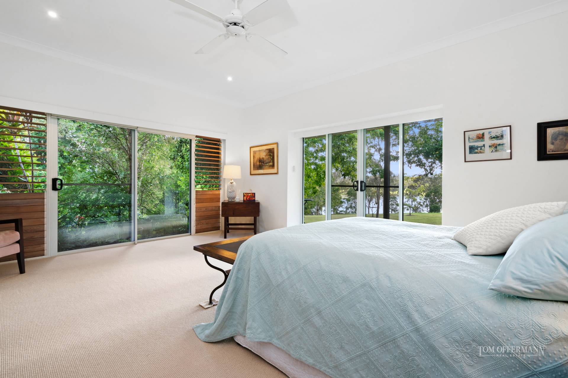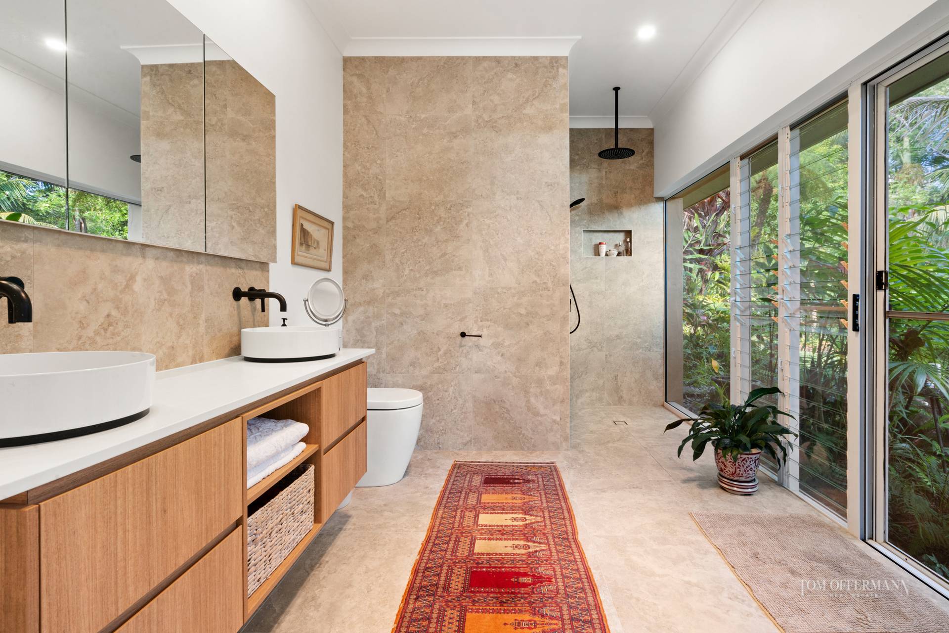 There is a delightful sense of arrival as you step from the vehicle and approach the large timber pivoting door formal entry. The home is cocooned in a sub-tropical wonderland of lush plantings created and nurtured by the present owners over two decades.